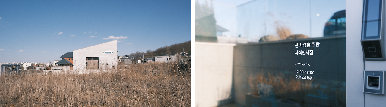 출판단지 인근에 큰 식당과 카페들이 모여 있는 돌곶이길이라는 곳이 있는데, 그 근처 주택가 쪽으로 조금 들어가면 외쪽지붕이 눈에 띄는 낮은 건물 하나가 있습니다. 서점은 그 건물 지층(건물의 1층과 지하 사이의 공간)에 위치하고 있어요. 풀네임은 아래 사진에서 보시다시피 ‘한 사람을 위한 사적인 서점‘입니다. 저는 지금까지 아직 총 두 번밖에 방문해보지 않은 라이트한 손님이지만, 첫 방문 시의 인상이 워낙에 좋았기에 그때의 느낌과 이 서점만의 고유한 특징을 공유해보려고 합니다.