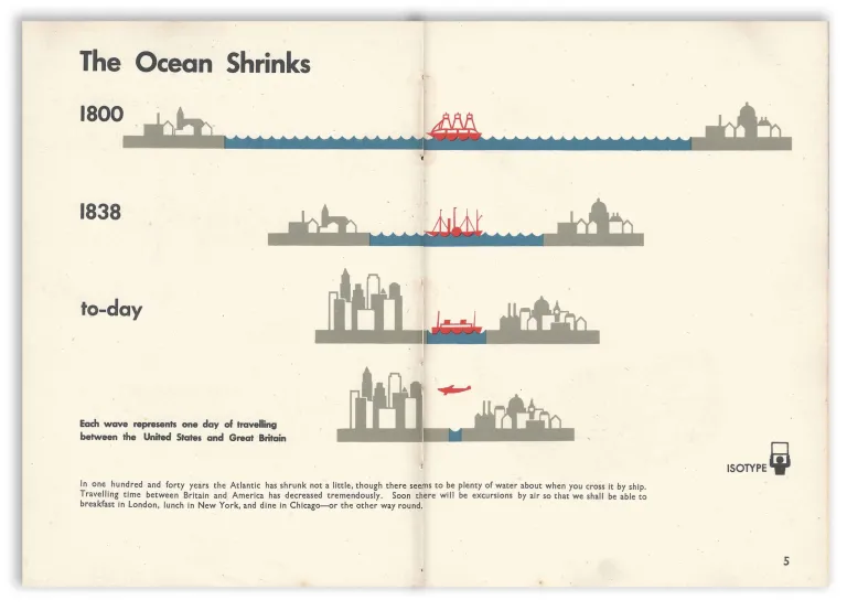 위 이미지들은 『Only an Ocean Between』에 실린 인포그래픽으로, 노이라트 부부가 Isotype Institute를 설립한 후 진행한 아이소타입 작업입니다. 보시다시피 각종 수치를 숫자나 도형이 아닌, 누구나 알아보기 쉬운 그림으로 표현하고 있죠.