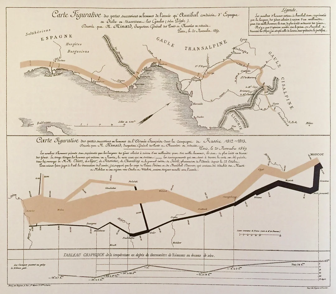 미나르의 그래픽은 다변량(3개 이상의 변수를 동시에 분석하는 방식)의 데이터를 통해 풍부하고 일관된 이야기를 전해주는데, 이는 단순히 하나의 변수가 시간에 따라 변하는 것을 보여주는 것보다 훨씬 더 많은 것을 이해하게 해 준다. 이 그래픽에는 여섯 개의 변수가 표현되어 있다. 군대의 규모, 2차원 표면에서의 지리적 위치, 군대의 이동 방향, 그리고 모스크바에서의 퇴각하는 기간 동안의 날짜별 기온이 그것이다. (...) 이는 아마도 지금껏 그려진 통계 그래픽 가운데 가장 뛰어난 작품일 것이다.