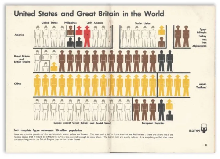 "The Ocean Shrinks"는 약 100여 년 간 기술의 발달함에 따라 미국과 영국 사이의 이동 시간이 줄어든 역사를 "바다가 줄어들었다"라고 은유해서 표현합니다. 사람들은 이 그림을 보며 그동안 변화해 온 두 나라의 관계를 떠올리거나, 이토록 가까워진 지금 미국과 영국의 관계가 앞으로 어떻게 달라질지 생각하며 여러 이야기를 꺼낼 수 있습니다. "United States and Great Britain in the World"는 세계의 인구를 인종과 지역 단위로 나누어 표현하고 있는데요. 제목에 등장하는 미국과 대영제국이 차지하는 비율이 겨우 1/4이 조금 넘는 정도라는 걸 한눈에 알 수 있습니다. 이 책이 출판되던 당시 미국과 영국이 세계에 압도적인 힘을 발휘하고 있었다는 걸 생각하면, 이 그래픽은 "이 세상은 정말 미국과 영국을 중심으로 돌아가고 있는 게 맞는가? 혹은 그래도 되는가?"라는 질문을 던졌다고 볼 수 있습니다.