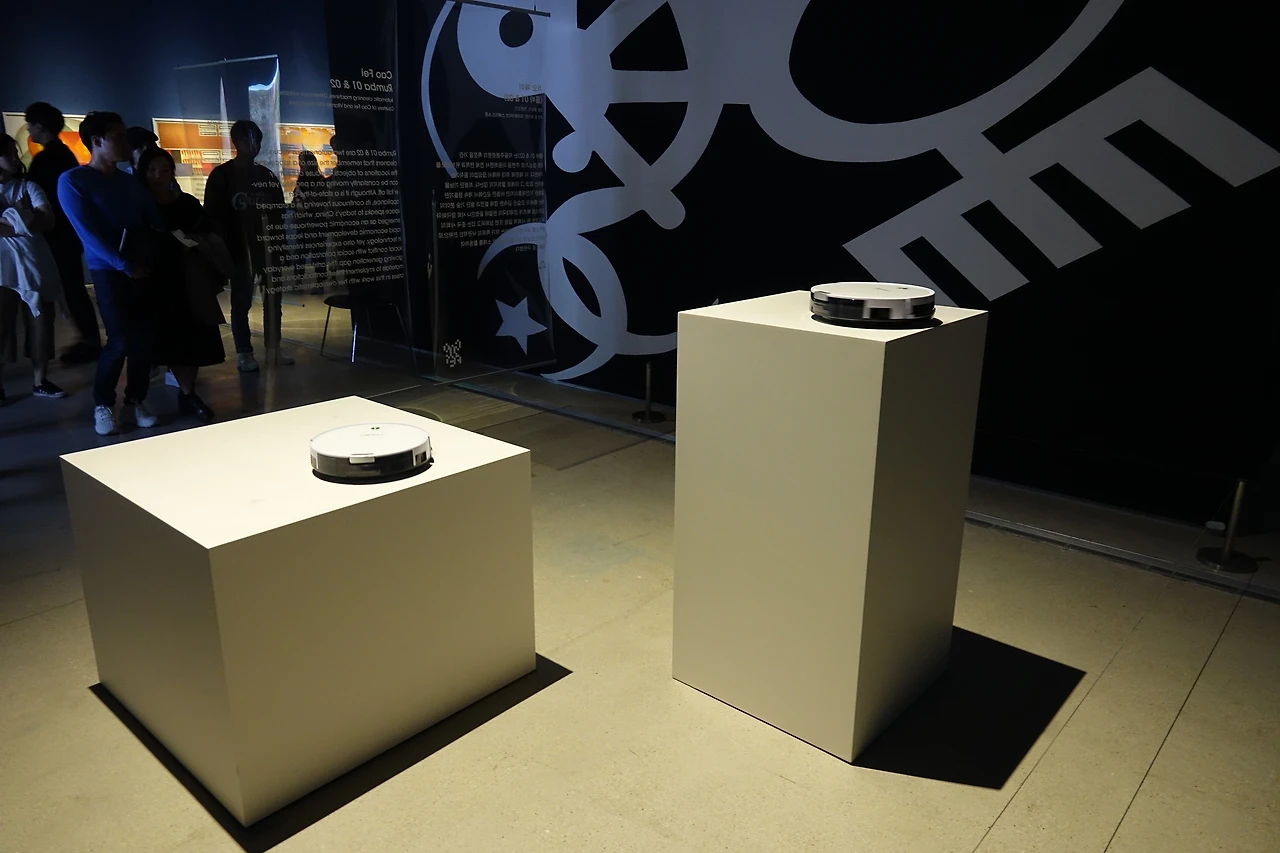 마지막으로 이 작업은 로봇청소기가 아주 좁은 단상 위에서 빙글빙글 맴도는 연출입니다. 요즘 로봇청소기는 집 구조를 지도로 그려 저장한 후 꼼꼼하게 빈틈없이 청소하고 다닙니다. 그런데 이렇게 좁은 단상 위에 올려놓으면, 끊임없이 그 위를 돌기만 합니다. 로봇청소기는 떨어지지 않도록 짜여 있습니다. 그러니까 감옥에 갇힌 것만 같습니다. 이 작가는 오늘날 중국의 현실을 이야기 합니다. 기술이 발전하고, 세상은 미래로 미래로 나아가는데, 사람들은 정작 높은 단상 위에서 자칫하면 떨어지는 곳에 있다는 것입니다. 이렇게 갇혀서, 따로 떨어진 섬에 갇힌 것만 같다는 말입니다. 중국이 그러한데 사실 한국에서도 공감이 갈 법한 이야기입니다. 컴퓨터로 이뤄지는 각종 인사시스템, 소프트웨어로 일하는 사람들, 주민등록번호와 전자정부의 데이터로 처리되는 일상생활을 생각할 수도 있겠습니다.