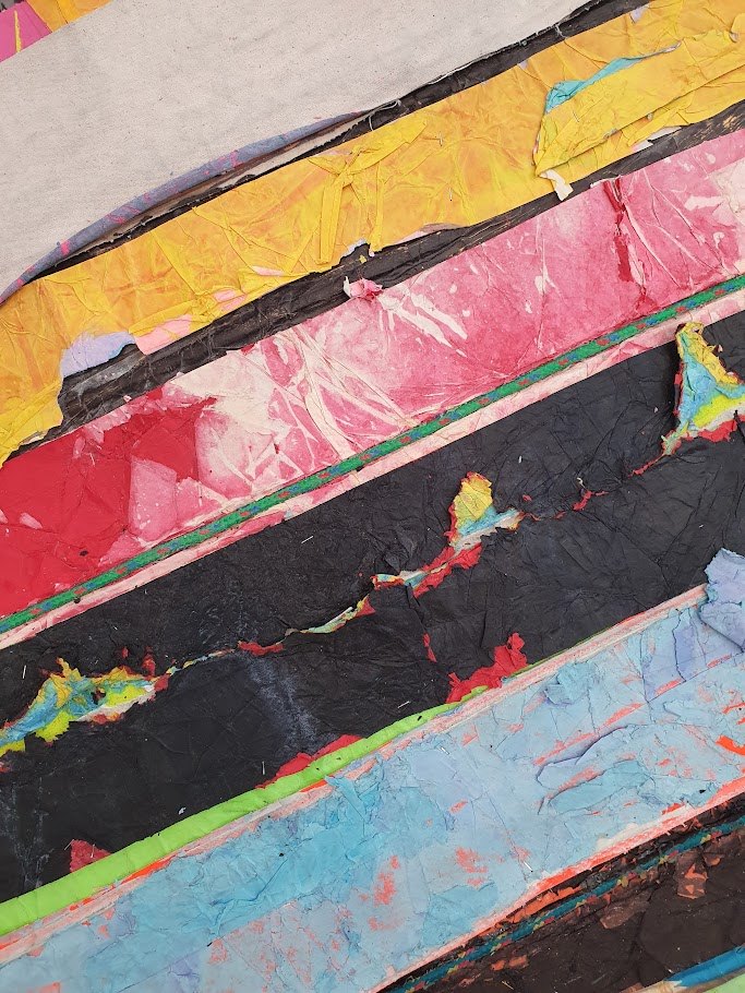 산업사회의 공산품들은 대개 필요 이상의 색을 뒤집어쓰고 있다. 작가는 그가 수집한 일상의 소재들, 당연히 색을 지닌 소재들을 배열해 알록달록한 패턴을 만든다. 별로 특이한 소재도 아니다. 종이, 로프, 이런 것들이다. 그런데 그 쓰레기들의 배열이 아름답다. 초원에 펼쳐진 꽃밭을 보는 것과 같다. 그는 어떻게 저런 색의 패턴을 이토록 넓은 공간에 흩어놓았을까? Y는 생각했다.