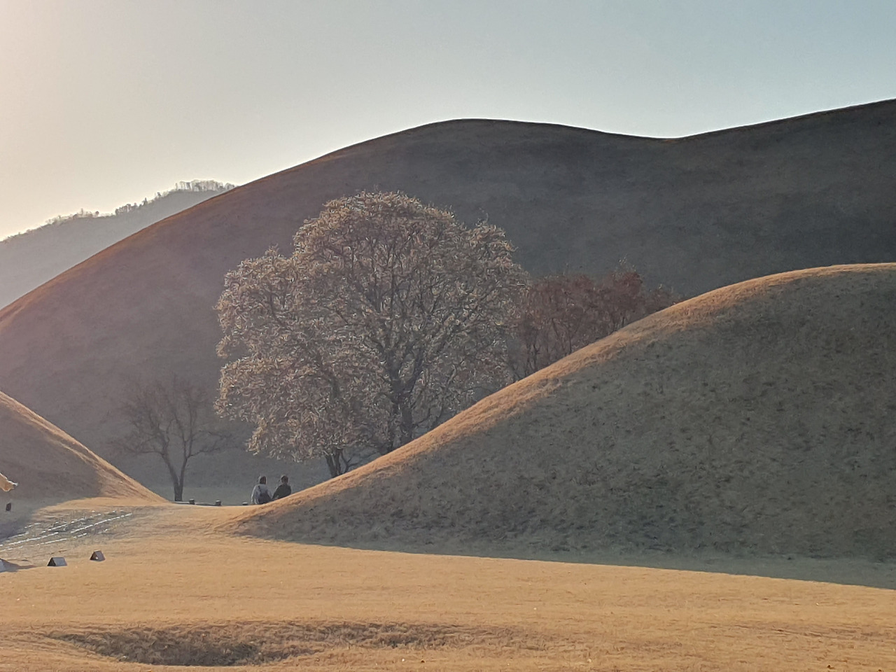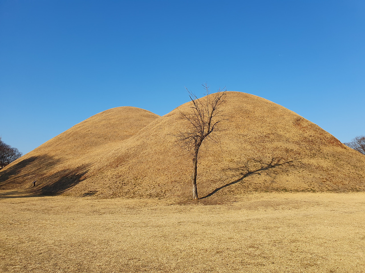 봄은 가까웠지만 아직이었다. 능은 노릇했다. 벌거벗은 나무 한 그루가 해시계처럼 능 위에 길쭉한 그림자를 드리웠다.