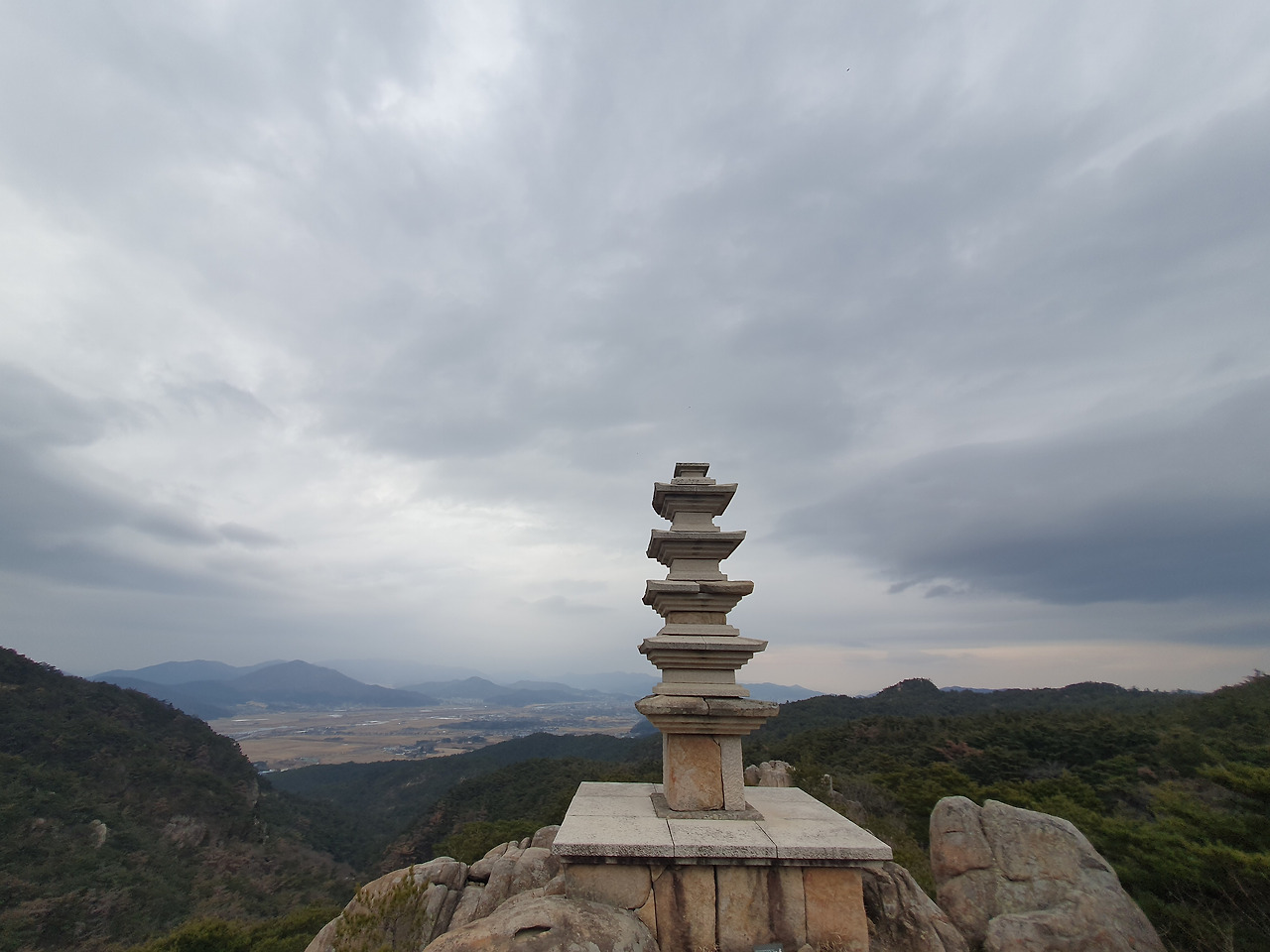 늠비봉은 100m 정도 높이의 바위산이다. 이 봉우리에 기단을 만들고 오층탑을 쌓았다. 자체 높이는 7m도 정도 된다는데 봉우리 위에 솟아 하늘과 닿아있다. Y는 내려가는 길에 만났지만, 포석곡으로 올라오다 보면 계곡 어디에서도 보인다고 한다. 위 설명에도 나오지만 연구자들은 이 탑을 신라 계통이 아니라 부여 정림사 5층 석탑처럼 백제 계통의 탑으로 분류한다.