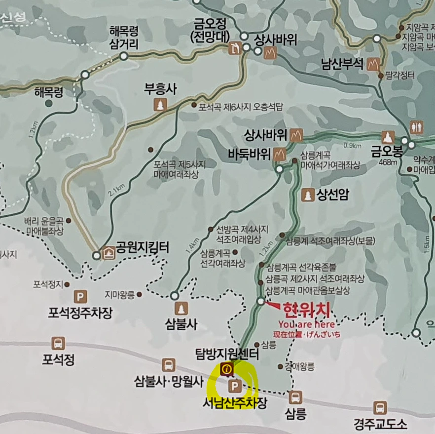 경주 남산에 오르는 길은 여러 코스인데, Y는 지도에서 노란색 형광펜으로 원을 그려놓은 서남산 주차장(포석로 647) 쪽으로 올라가는 코스를 택했다.