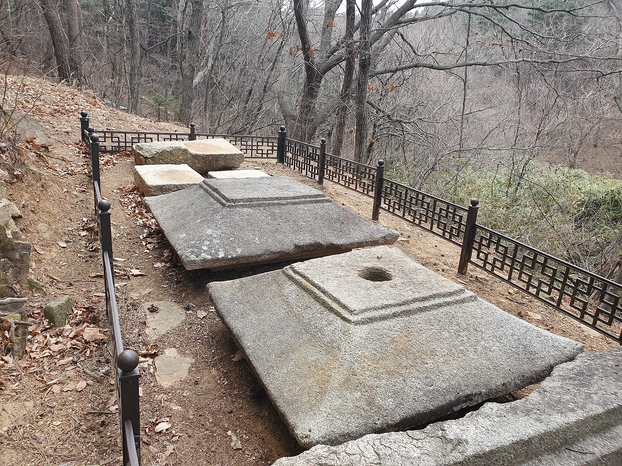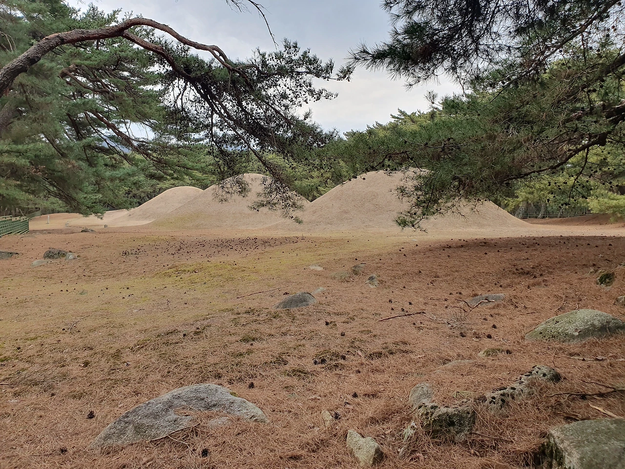 겨울의 마지막이어서 그런지, 삼릉은 나이 들어 머리가 센 것처럼 희끄무레한 빛이었다. 주변에 잘생긴 소나무들을 푸르게 병풍처럼 두르고 있어서 그런지 대왕릉 쪽에서 보았던 능들과는 좀 다른 느낌이 있었다. 높지 않은 철제 울타리가 있어서 삼릉 바로 옆으로 다가갈 수는 없다. 그렇지만 안내책자에서 봤던 것과 비슷한 구도로 사진을 찍기에 어려움은 없다.