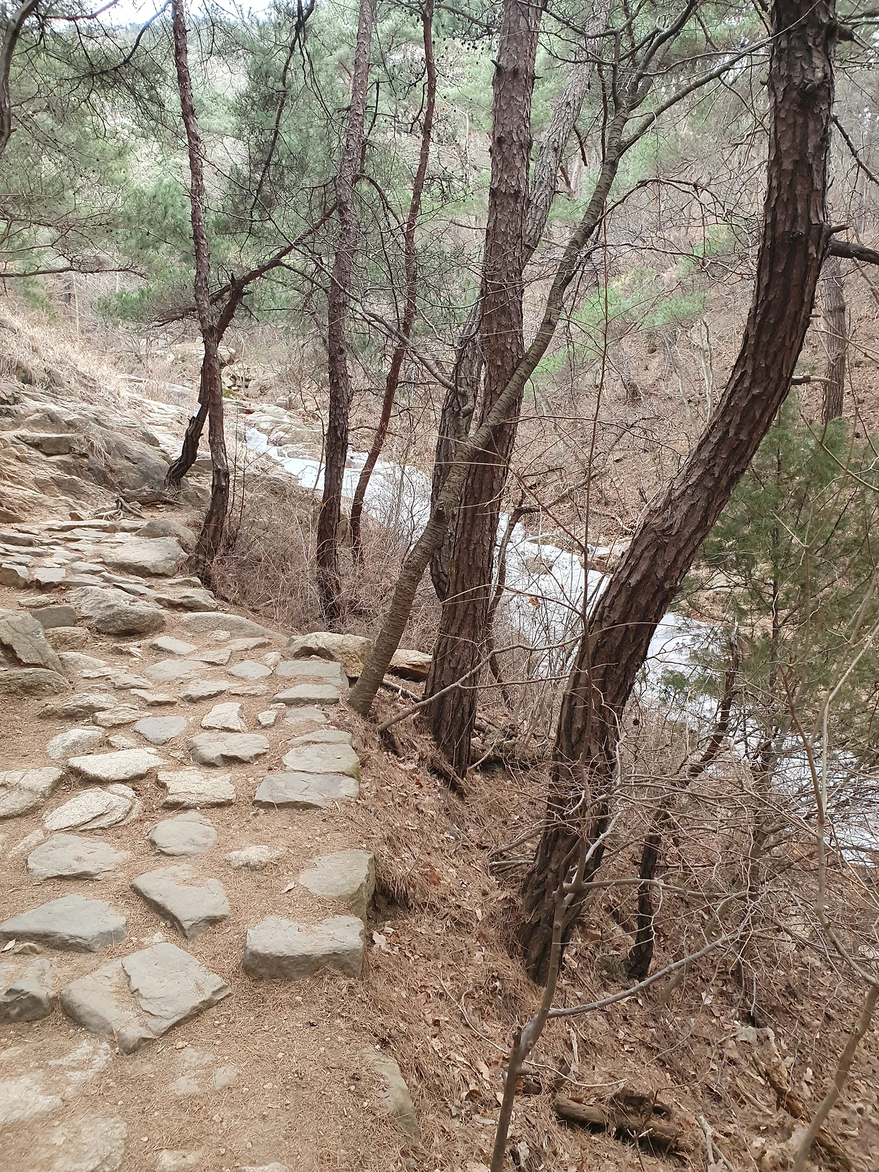 우산이나 우비를 가져오지 않은 터여서 덜컥 겁이 났다. 소설가 Y는 사실 겁쟁이였다. 쏟아질 비 같지는 않았다. 포석정으로 내려오는 길 또한 계곡과 인접한 코스다. 흰 얼음을 품고 있는 계곡을 만났다 헤어지길 반복 했다.