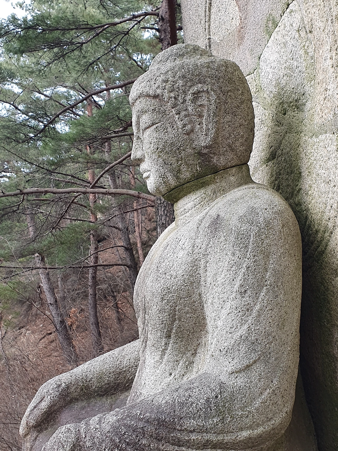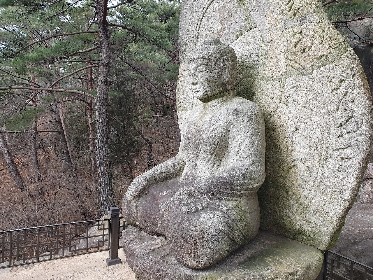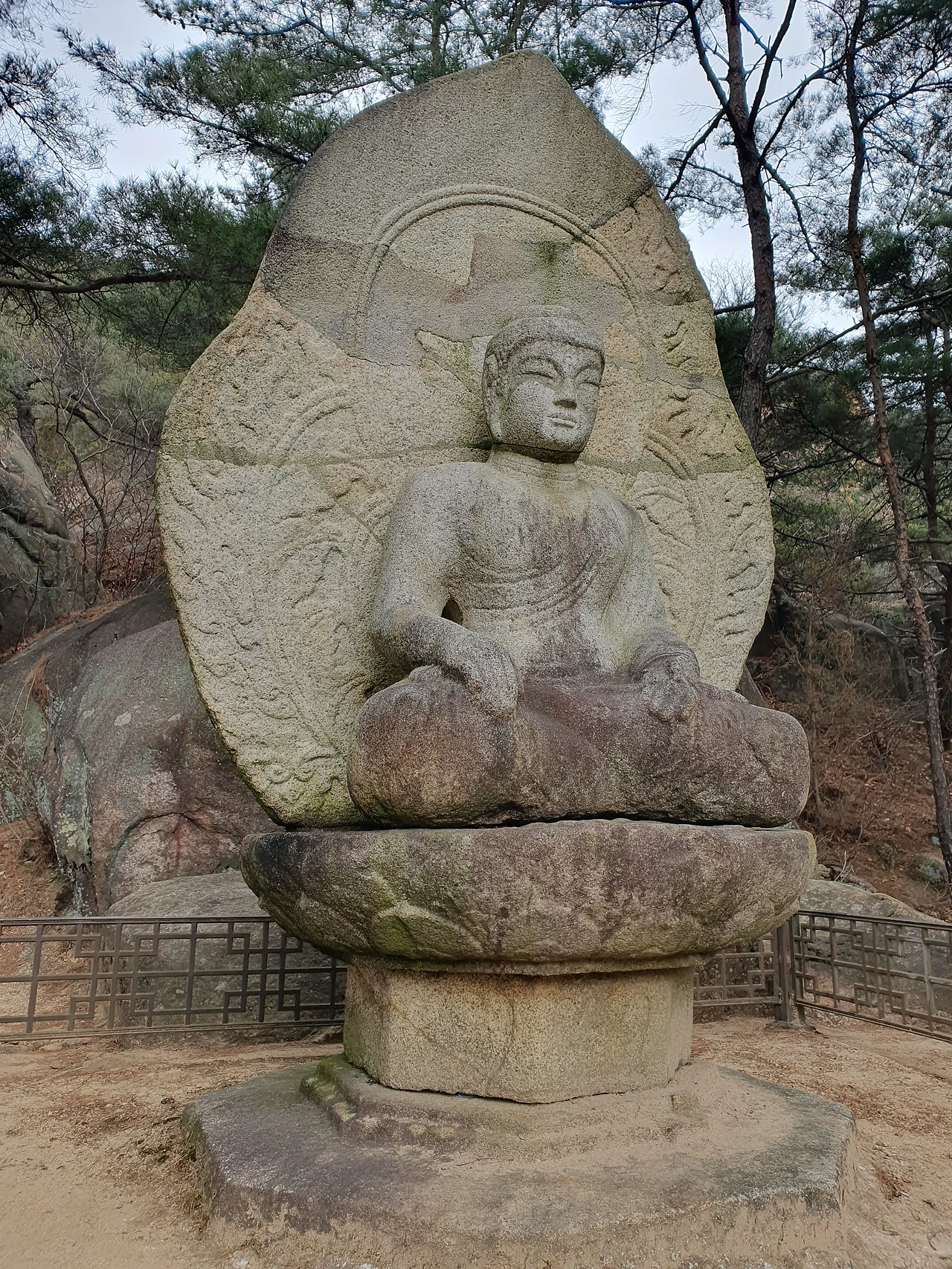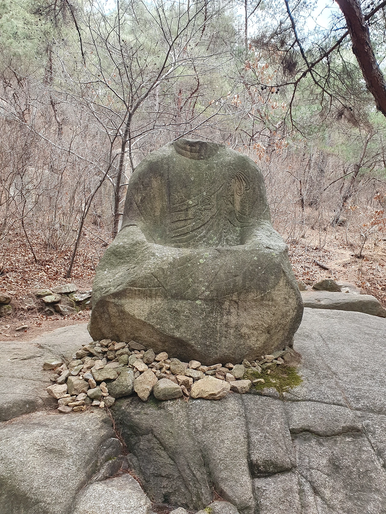 조금만 더 올라가면 갈림길 가운데 석조여래좌상(石造如來坐像)이 서 있다. 바위 위에 앉았는데 가부좌를 틀고 있는 모습이다. 머리는 훼손되어서 볼 수 없다. 안내판을 보니 원래부터 이 장소에 있었던 것은 아니고, 1964년 계곡 옆에서 발견되어서 지금의 위치에 옮겨놓은 것이라고 되어있다.