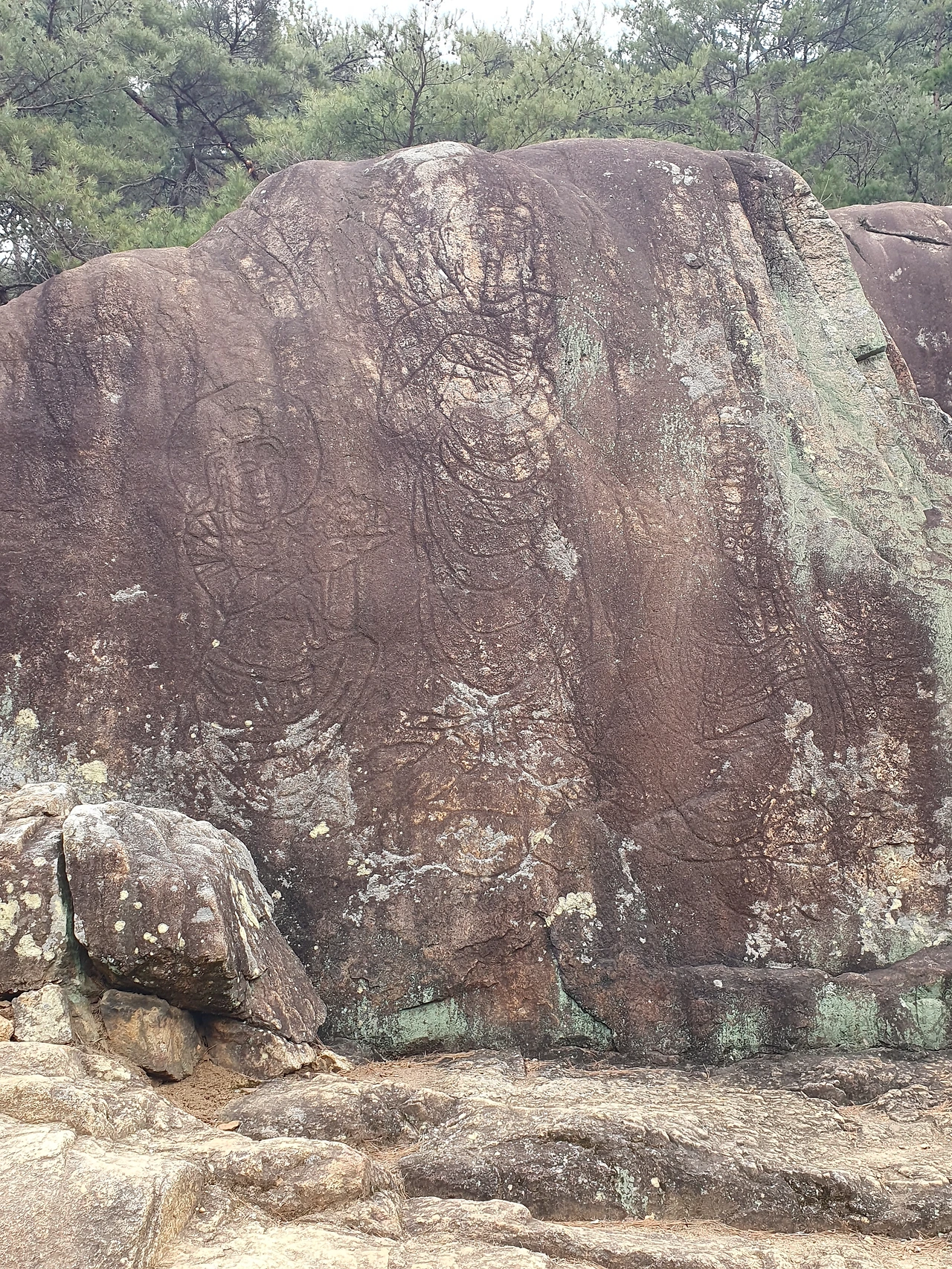 연구자들은 이 선각육존불이 통일신라 말기, 그러니까 왕권이 약해지고 사회가 혼란해지면서 후삼국 시대로 넘어가는 9세기에 조성된 것으로 보고 있다. 9세기면, 벌써 천 년이 훨씬 넘은 과거에 만들어졌다는 얘기다. 10년이면 강산이 변한다는데, 강산이 100번 변할 시간을 바위 위에 선으로 새긴 마애불이 견뎌온 것이다.