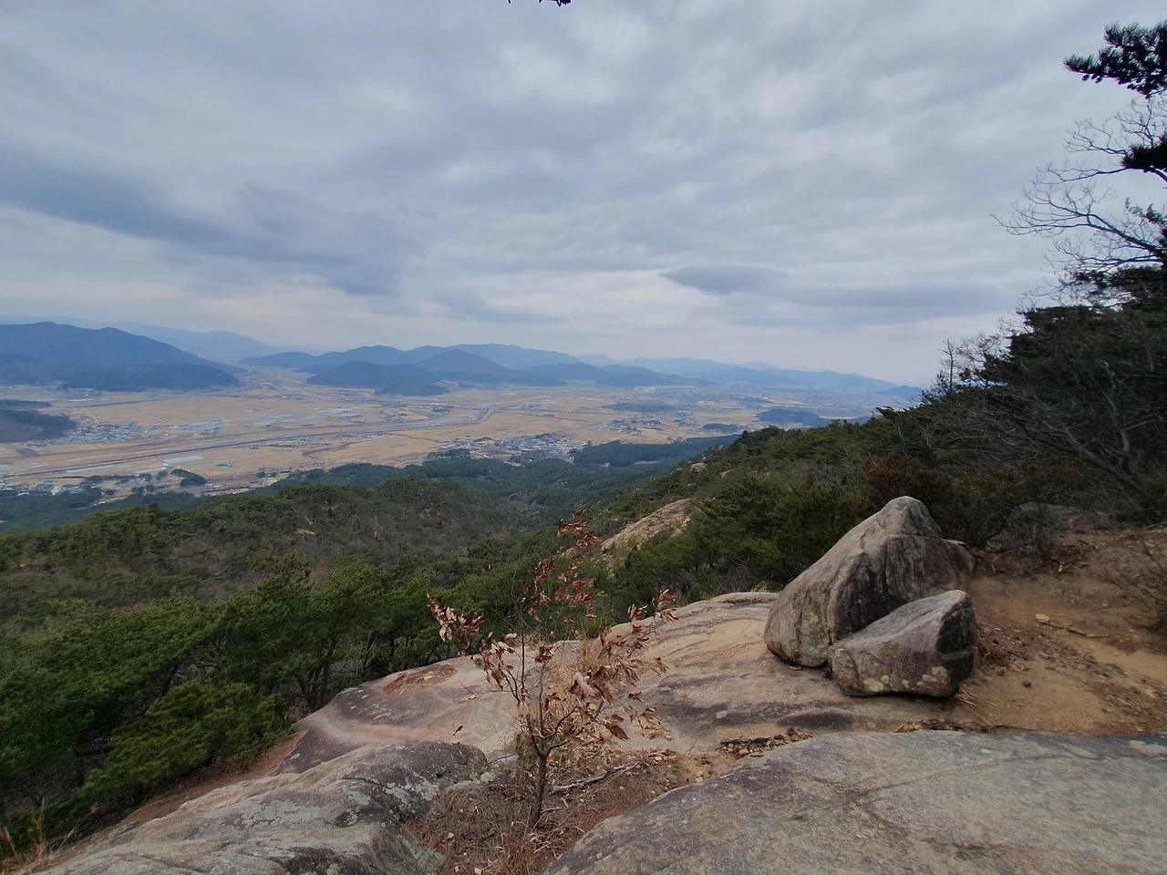 산행을 할 때 정상까지 오르는 길은 대개 계곡 길이다. 삼릉계 코스도 마찬가지다. 그런데 상선암에 이르러서는 탁 트인 정경을 볼 수 있는 기회가 생긴다. 들판에 봉긋봉긋 봉우리가 솟아있고, 가운데로 분지의 입구가 뚫려있다. 저쪽이 경주로 들어오는 경주 톨게이트이다.