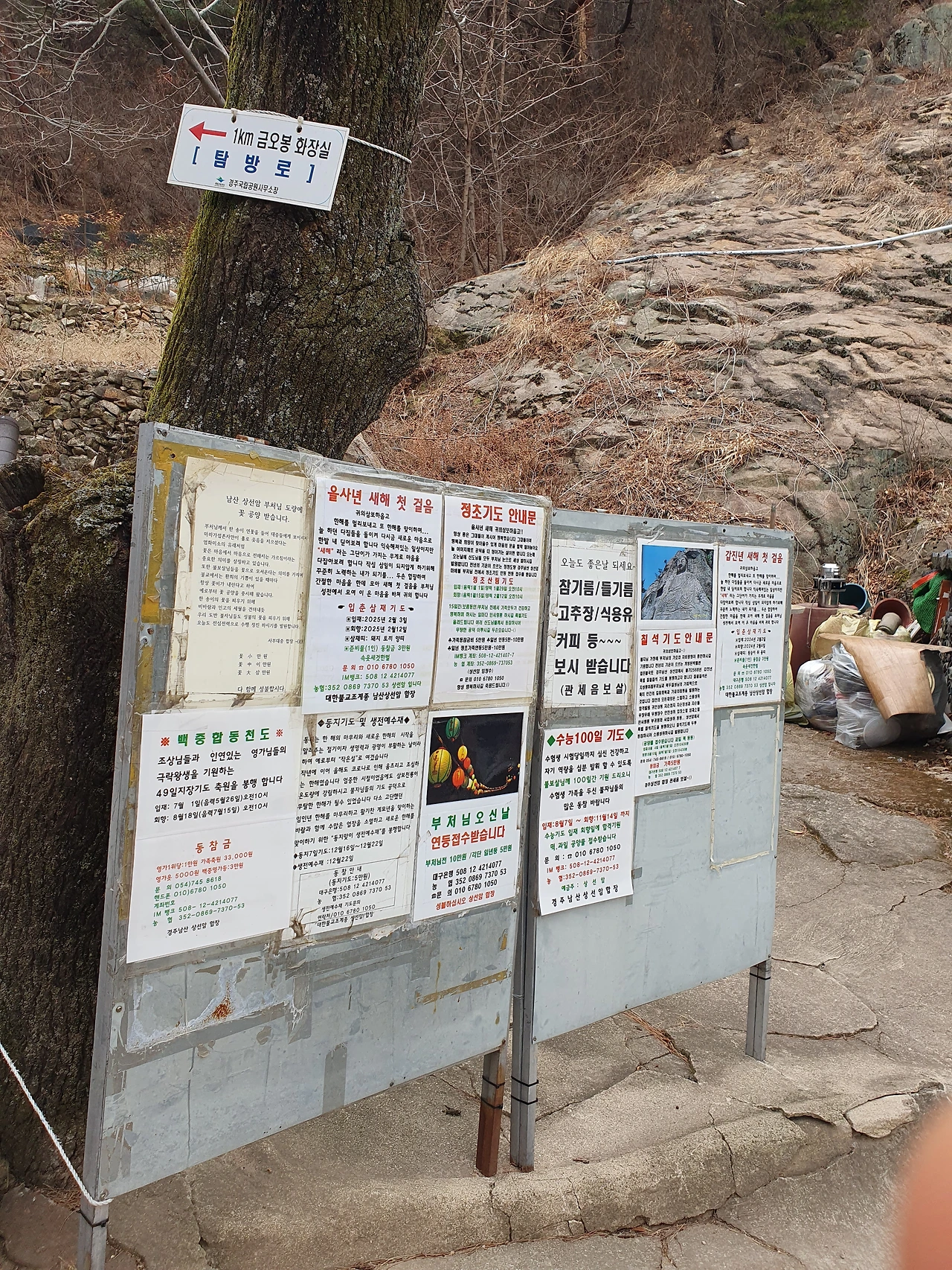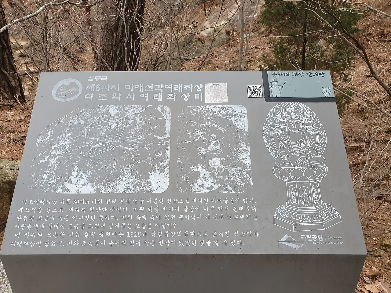 가다가 보면 길 오른쪽에 통제 구간이 있다. 낙석위험 때문에 폐쇄된 길이라고 나와있다. 마애석가여래좌상 쪽으로 가는 길이다. 과거에는 여래좌상을 가까이서 볼 수 있었던 것 같은데 지금은 갈 수 없다. 다만 폐쇄된 길을 돌아서 내려다보는 구도로 볼 수 있다.