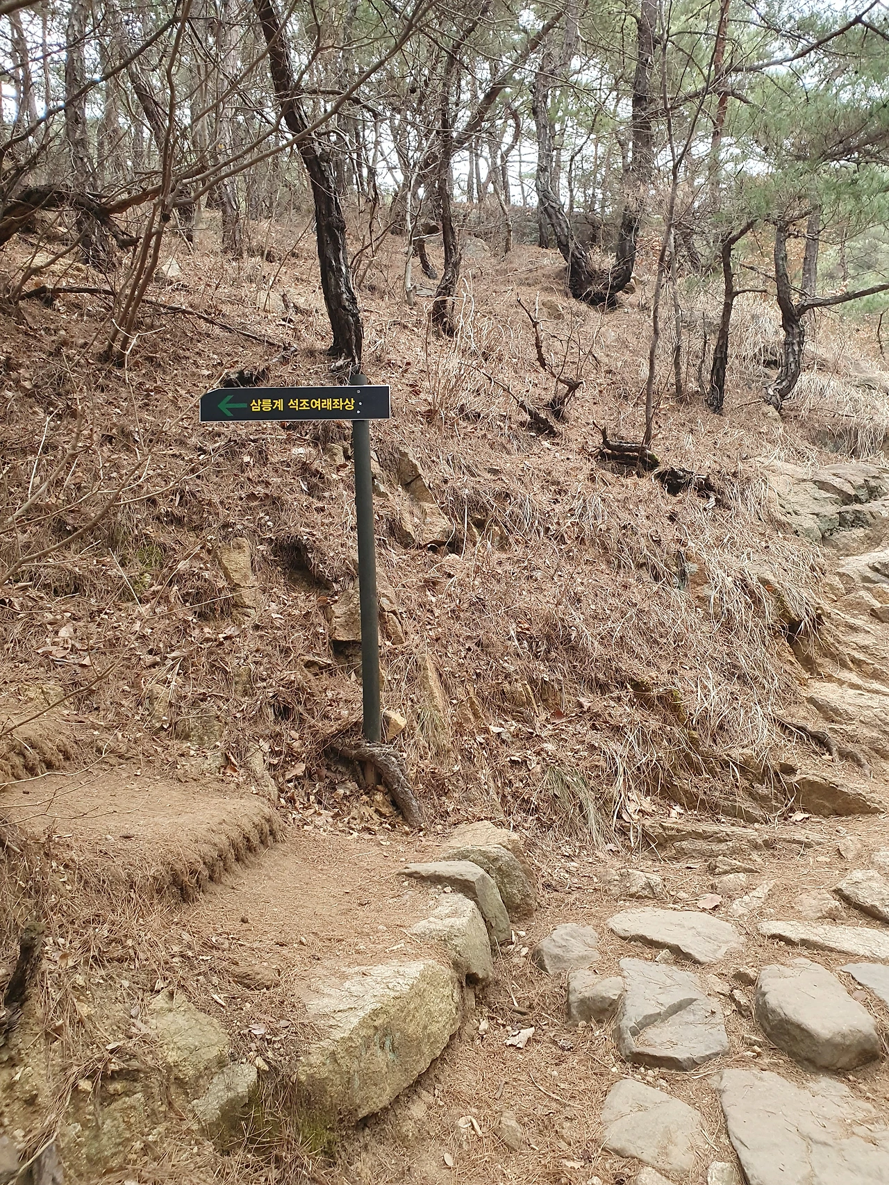 서남산은 경주 시내 중심에서 멀지 않다. 걸어올 수도 있는 거리지만, 산에 오를 힘을 미리 소비하면 안 되니까 버스나 택시를 타는 게 더 좋을 것 같다. 주차장에서 길을 건너면, 정확히 어디가 등산로 입구인지 분명하지 않다. 그런데 걱정할 필요는 없다. 등산로가 긴 계곡을 따라서 형성된 길이다. 그러니까 길을 벗어날 가능성이 낮다는 얘기다. 어느 쪽으로 가도 삼릉 쪽에서 만난다. 한 100미터 정도 걸어 올라가면 길 오른쪽으로 삼릉이 보인다.