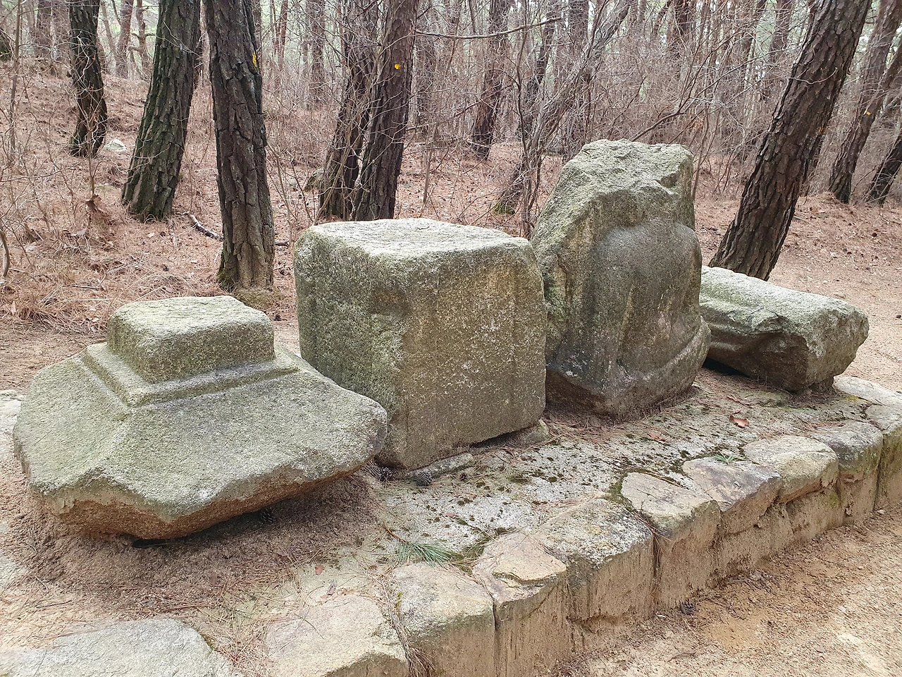 삼릉계에서 처음으로 만나는 건 '제1 사지 탑재 및 석재'이다. 길 오른편에 있다. 사지(寺址)는 절이 있던 터, 즉 사찰의 옛터를 의미한다. 그러니까 해석하자면 첫 번째 사찰의 옛터에서 발견된 것들이란 뜻이다. 오른쪽에서 두 번째 서 있는 건 돌로 조각된 앉은 모습의 부처 상(石造如來坐像)인 것으로 보이는데 아마 옛날, 아주 옛날 절 경내의 어느 곳에 세워져 있었을 것이다.