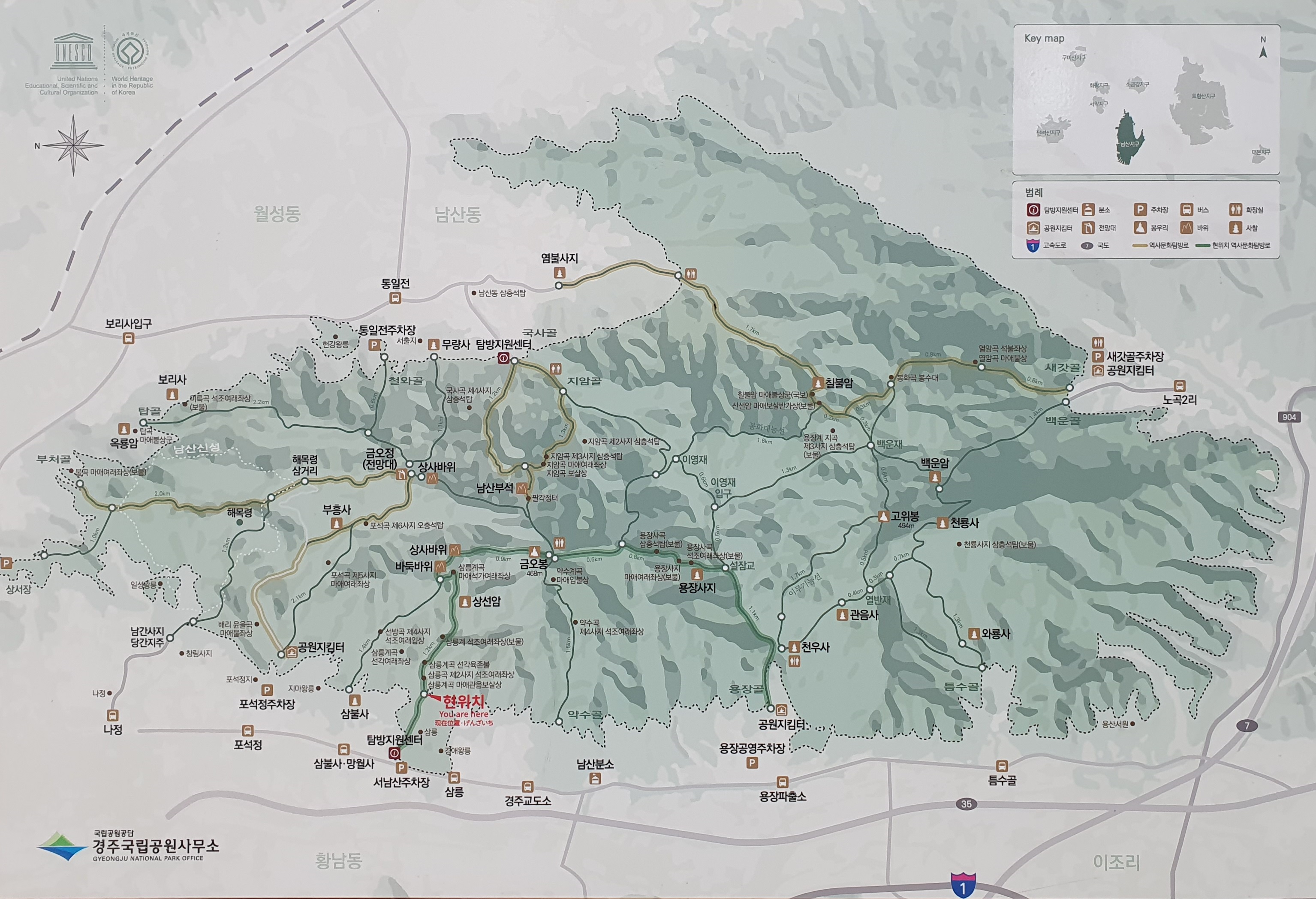 슬쩍 자료를 훑어보니, 경주를 사랑하기 위해서는 반드시 남산을 가봐야 하는 거구나 했다. 경주 남산은 신라의 도읍이었던 경주 분지 남쪽에 있는데, 혹자는 '신라의 천년 역사가 응축된 공간'이라고 표현한다. 건국 설화를 비롯해 다양한 전설이 남산과 연결되고, 신라와 신라인의 흔적이라 할 수 있는 문화유적이 100여 개나 분포한다. 그래서 사장님이 '뚜껑 없는 박물관'이라는 표현을 쓰셨구나, 고개가 끄덕여졌다.