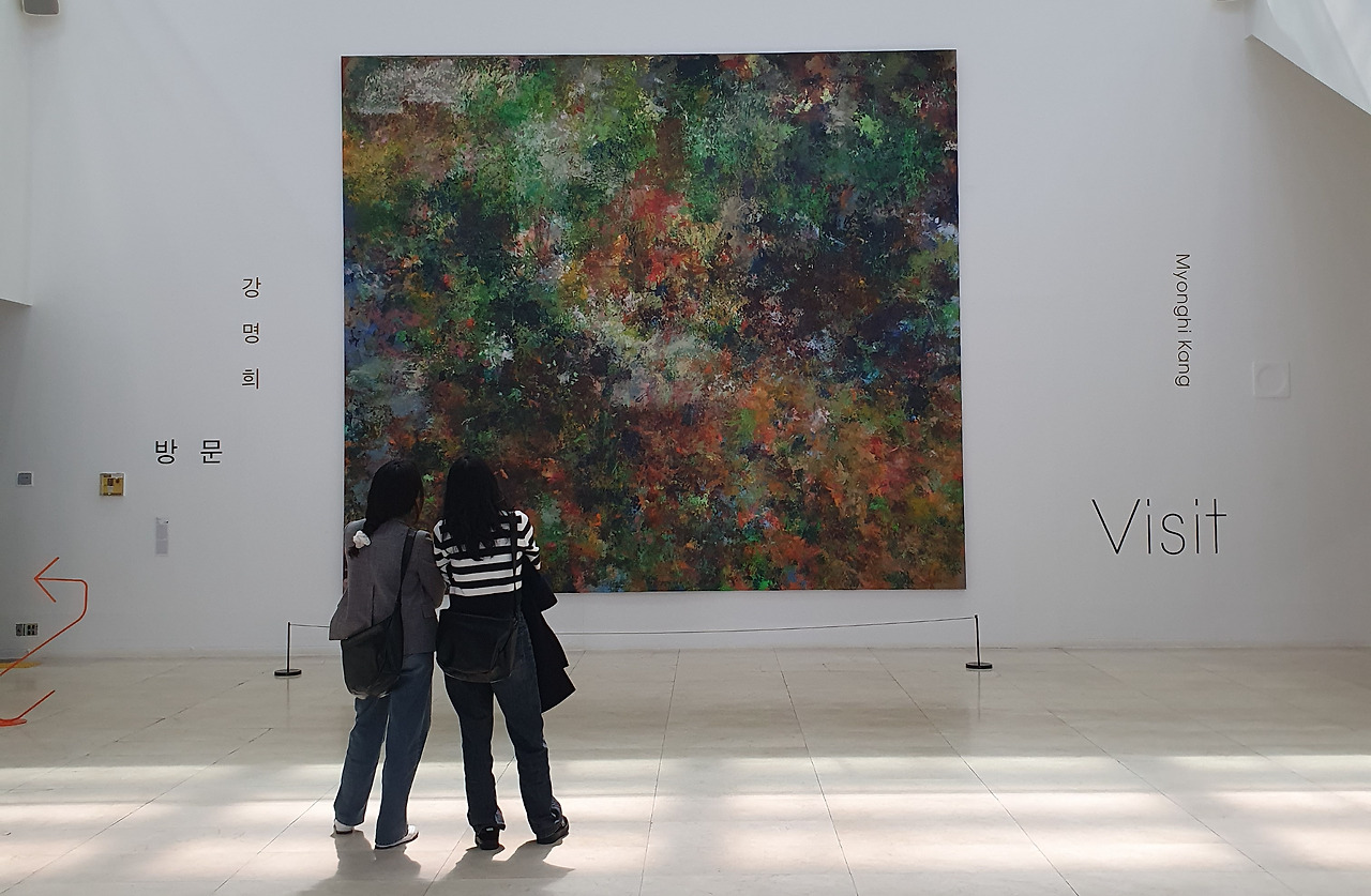 서울 시립미술관 로비에 들어서자 마자 커다란 그림이 정면에서 사람들을 맞았다. 강명희 작가의 2002년 작품 <복원>이다. 462X528cm로 굉장히 큰 작품이다. 전시의 이름은 Visit, '방문'이었다. 이번에도 소설가 Y는 사전 정보가 전혀 없이 작가의 작품들을 구경하기로 마음을 먹었다. Y는 선입견을 배제하는 것이 감상에 도움이 된다고 믿는 편이다.