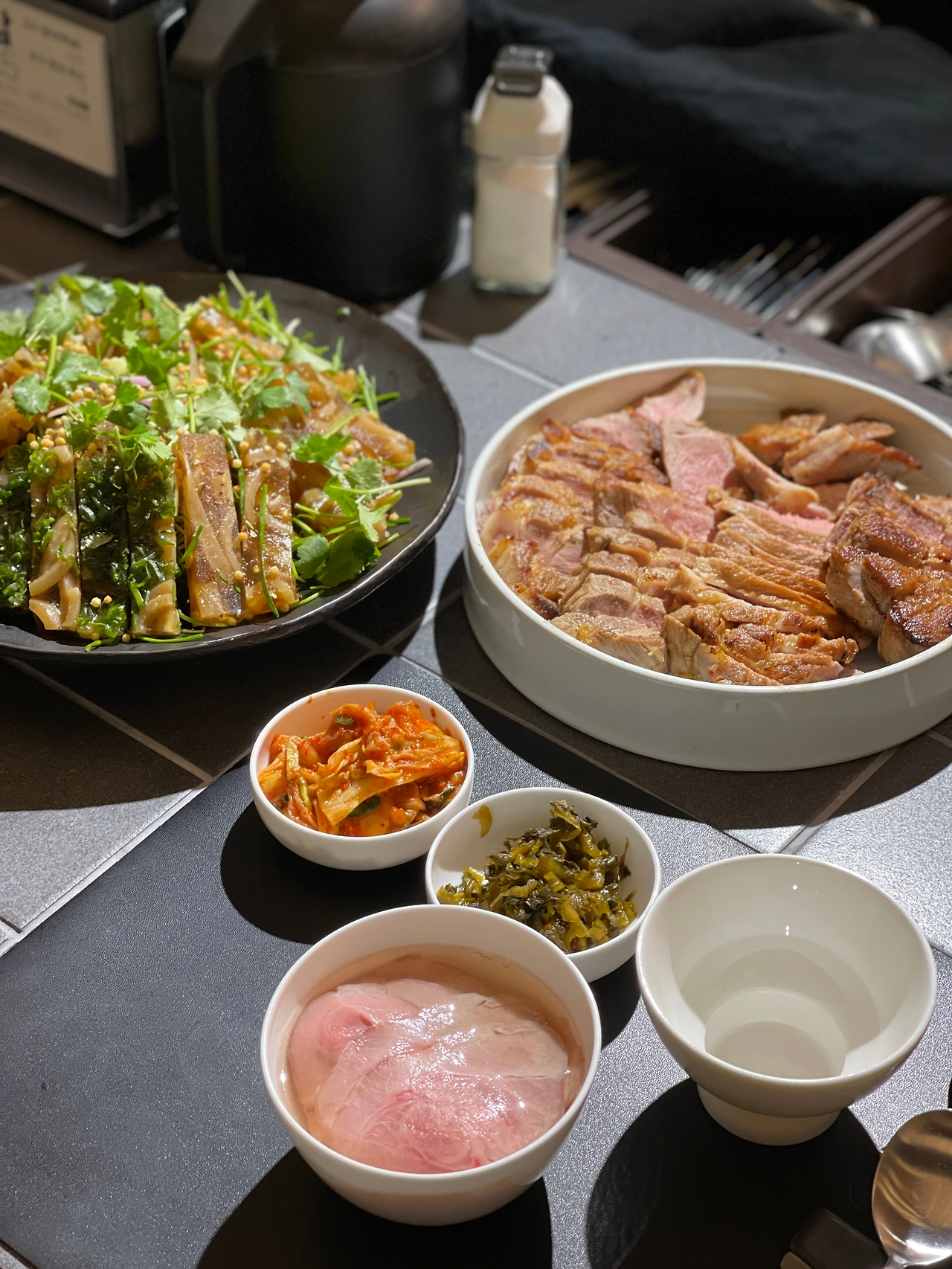 우리 국밥에 올려드리는 목살을 염지 후 구웠다. 고기 자체의 질이 좋은 편이라 그것만으로 충분하다 생각해 다른 가니쉬 등을 고려하지 않았다. 맛이 다양하고 강한 닭고기 구이가 있었고, 묵무침이 샐러드의 역할을 해주므로 핫 디쉬 정도로 생각하고 생각 없이 주워 먹을 만한 고기를 놓기 위해 준비했지만, 제일 빨리 없어졌던 플레이트. 선홍빛 돼지고기를 꺼려하는 직원 또한 줄어드는 것에 아쉬움을 표해주어 고마웠다.