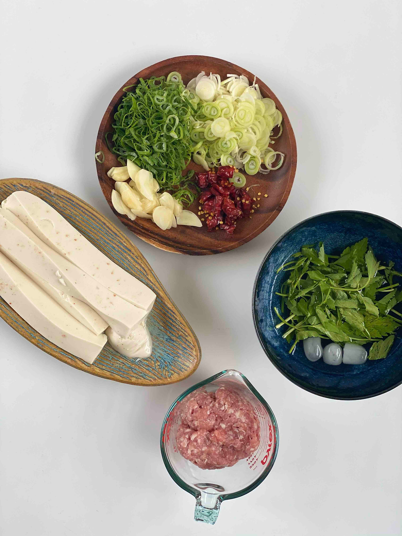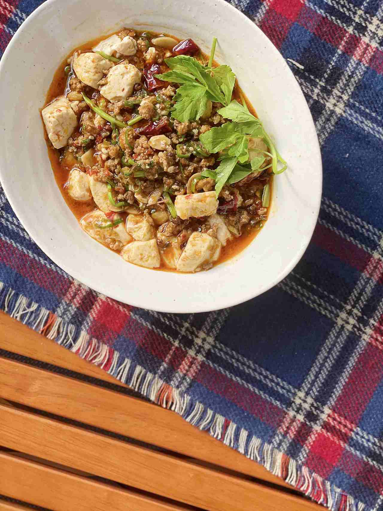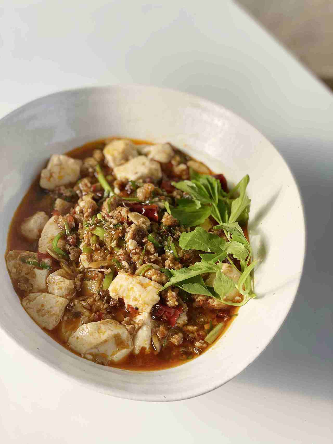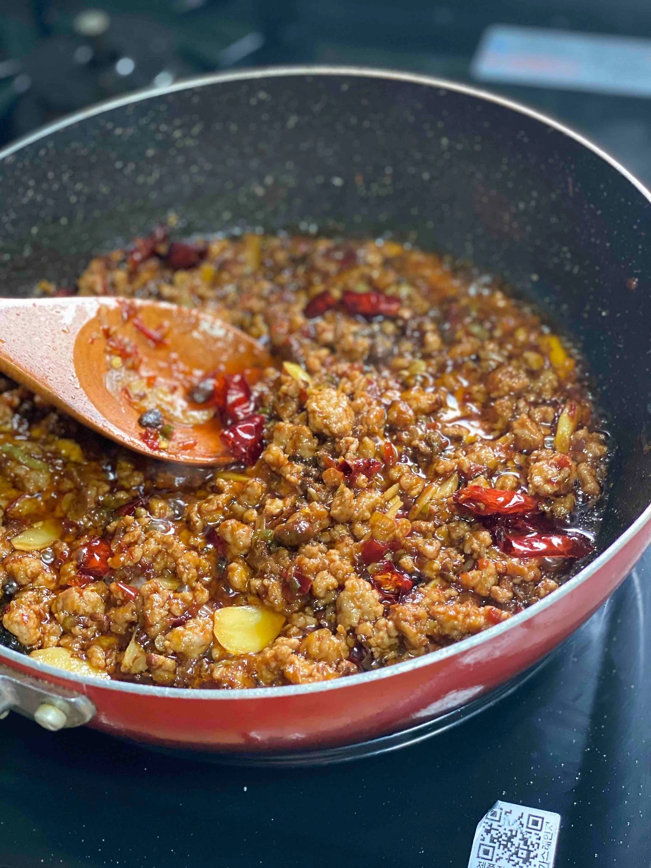 땅콩버터, 흑설탕, 굴소스는 돼지고기 수분이 다 날아간 다음에 첨가한다. 살짝 끓여 특유의 향을 살짝 날린 다음 물을 부어 끓여주면 살짝 뭉근한 페이스트처럼 된다. 그때가 순두부를 넣어야 될 타이밍이다.
