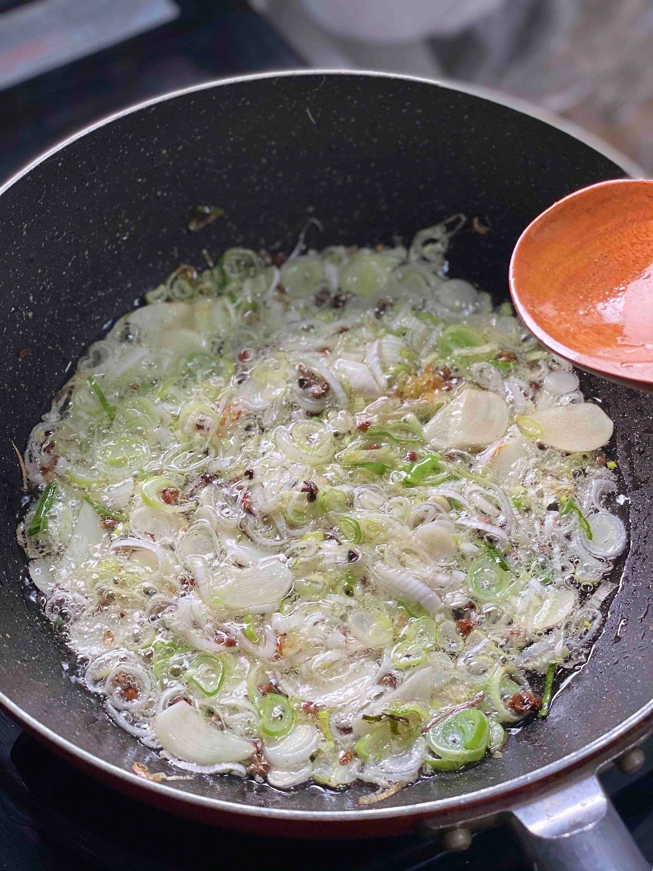 라드(돼지기름)를 먼저 낼 지 고민을 좀 했는데, 향채를 볶은 기름에 사용하는 게 확실히 향이 다양해진다.