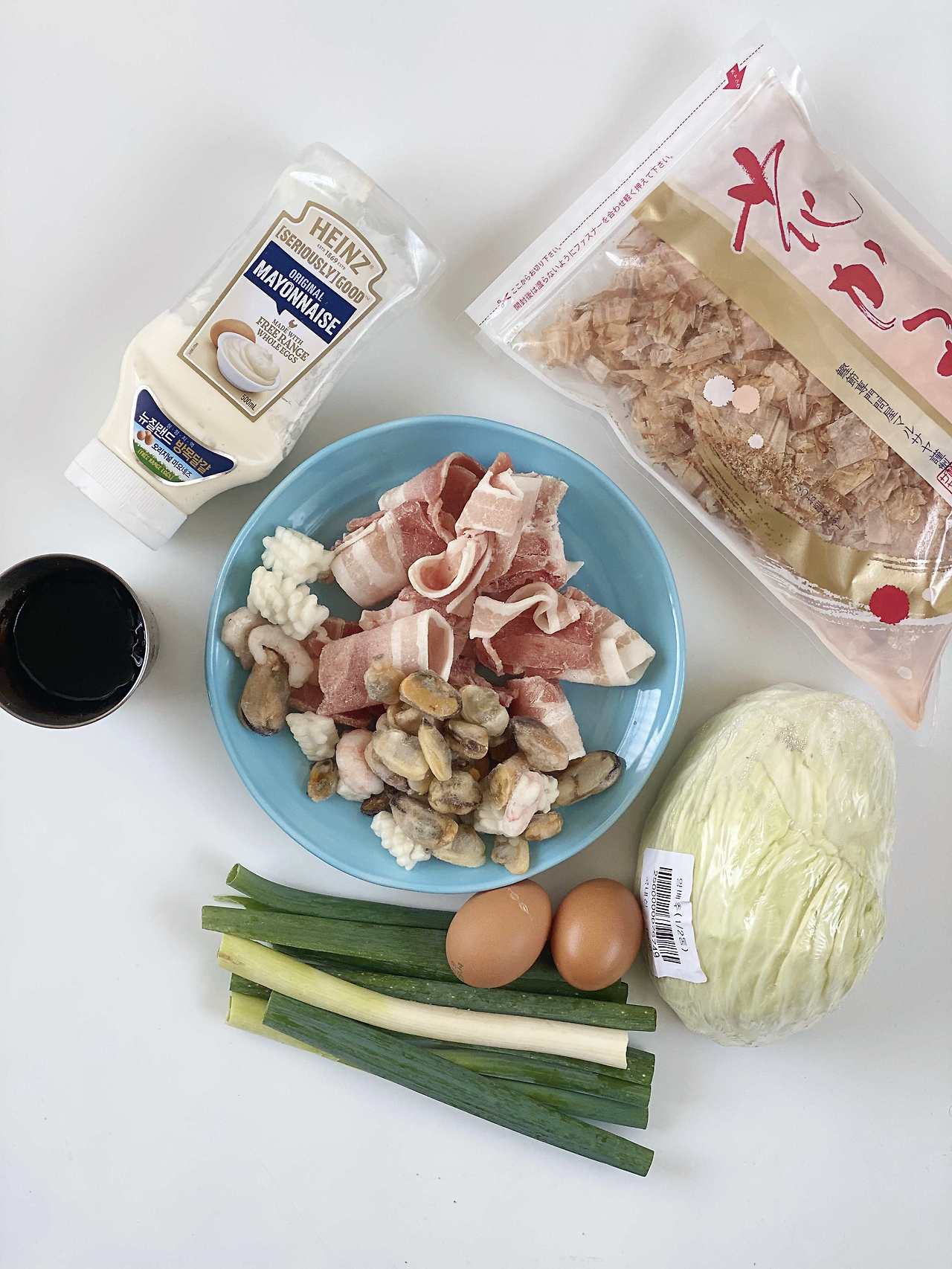 만화에서 보니 삼겹살, 해산물, 계란 반죽, 가다랑어포, 그리고 마요네즈와 데리야끼 소스가 필요했다.