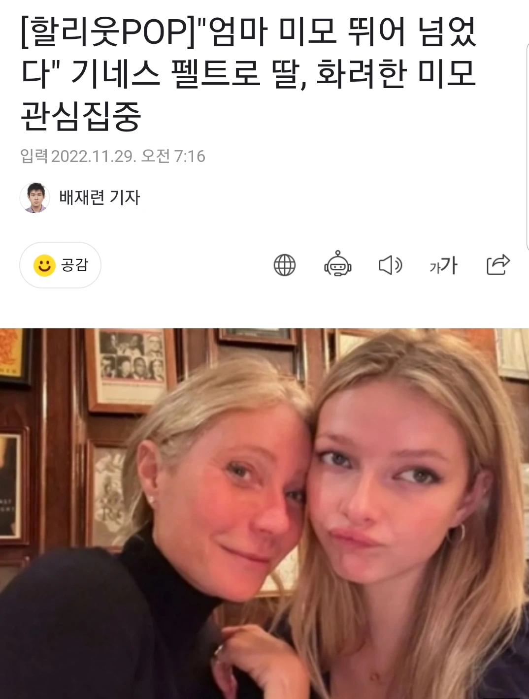 ‘엄마 미모 뛰어넘은 딸’이라는 제목 아래 기네스 펠트로와 딸의 사진이 있는 기사를 읽었다. 50세인 기네스 펠트로와 18세의 딸의 외모를 비교하는 것 자체가 말이 안 되는 것 아닌가. 세상에 기네스 펠트로라고요. 내가 왜 기네스 펠트로에게 동화되었는지 모르겠지만(그녀와 내가 무슨 공통점이 있다고) 함께 나이 들어간다는 건 할리우드를 이토록 가깝게 해 준다.