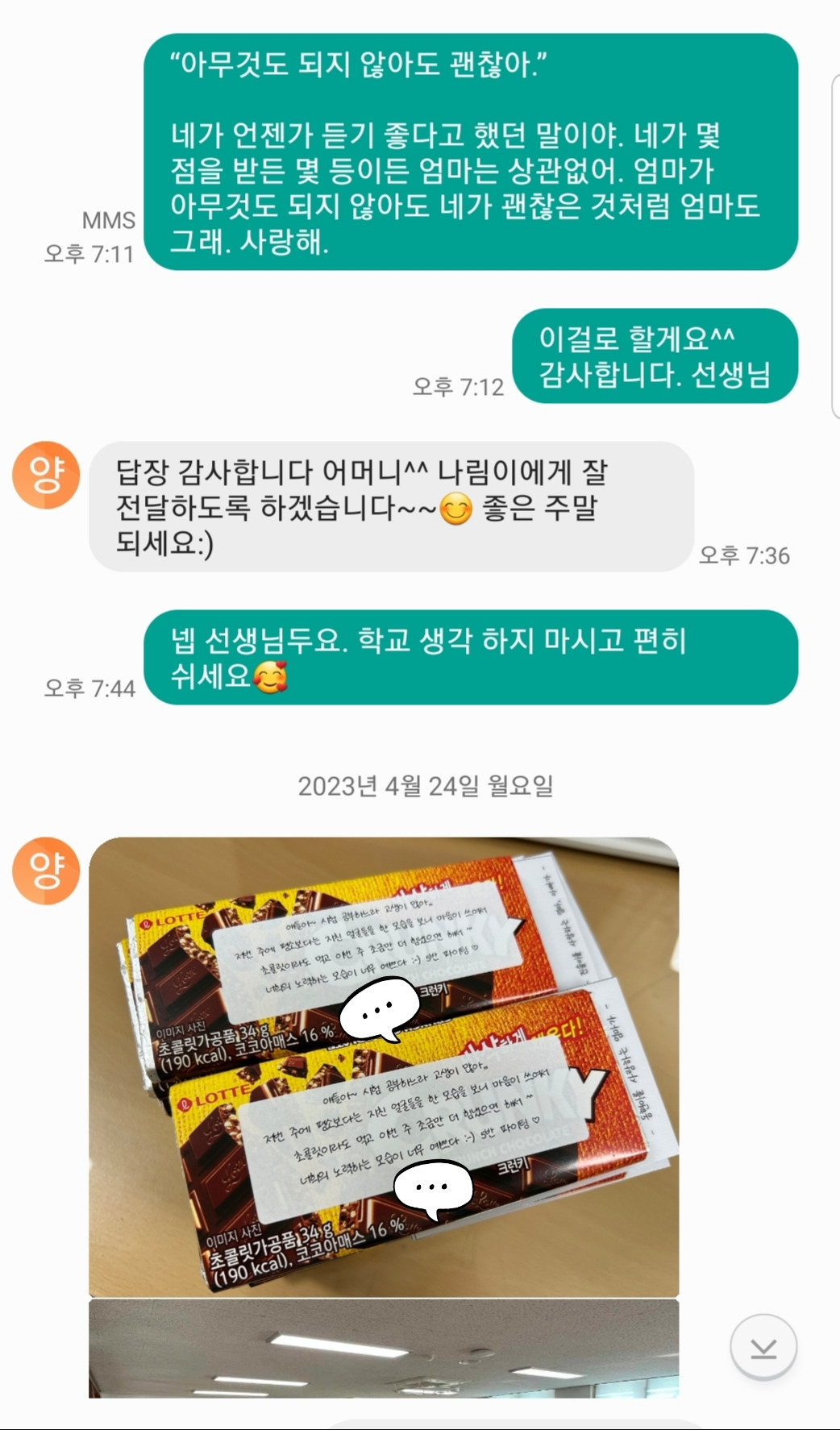 일주일 후 선생님이 아이들에게 간식과 메시지를 전달했다며 사진을 보내주었는데, 부모님이 보낸 글을 읽고 우는 아이들도 있었다고 했다. 시간이 흘러 중간고사 점수는 잊어버려도 이 기억은 오래 남을 것 같았다. 나는 우는 아이들 중에 초밥이도 있었나 하는 기대로 초밥이한테 물었다.