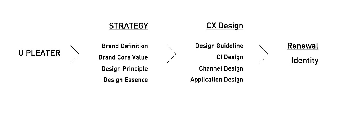 유플리트 리브랜딩 시각화 프로세스는 다음과 같으며 시각화 단계 전에 Strategy단계를 통해(디자인 전략) Design Principle 및 Essence를 도출하였습니다.