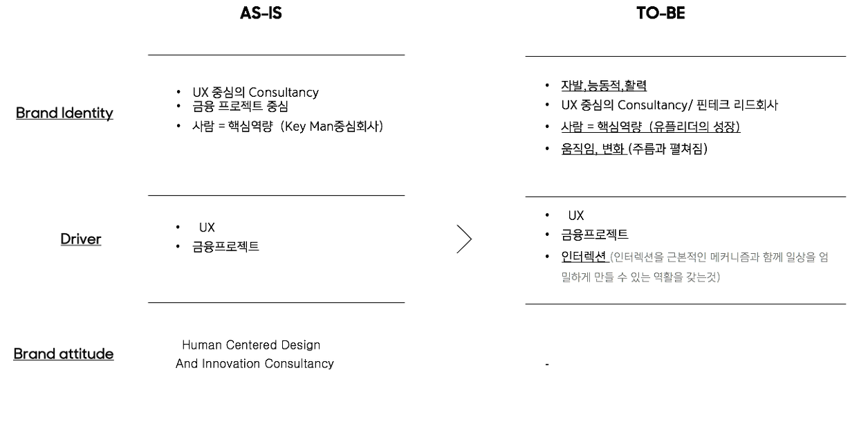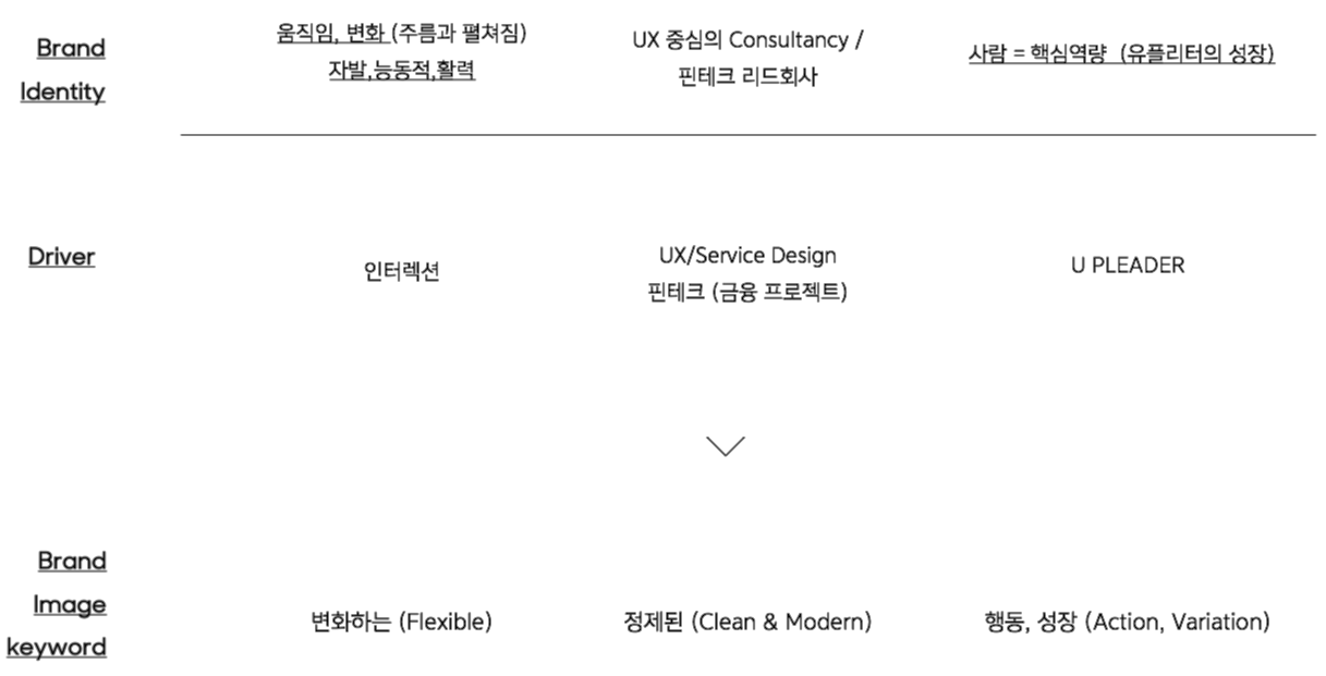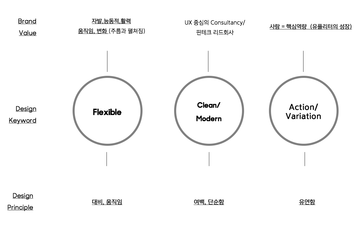 리브랜딩의 Project Goal에 도달하기 위해서는 유플리트가 보유하고 있는 역량과 활동을 기반으로, 고객들에게 효과적으로 어필할 수 있는 브랜드 핵심가치를 도출할 필요가 있었습니다. 유플리트는 인터렉션(상호작용을 통한 변화)과 UX/Service Design, Fintech를 통해 Flexible 함과 Clean&Modern을 동시에 보여주고 유플리트의 구성원인 유플리더들의 Action과 Variation이 유플리트만의 가치라고 생각했습니다.