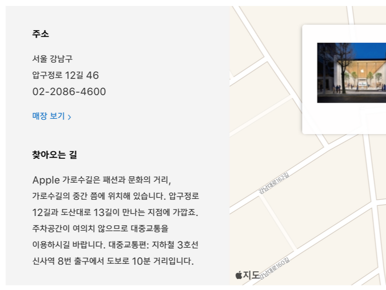 애플은 '패션과 문화의 거리, 가로수길의 중간쯤'이라는 어떻게 보면 모호하지만 일상 속 대화에서 쓰일 법한 말로 매장 위치를 표현하고 부가적인 설명도 완전한 문어체로 쓰여있다.