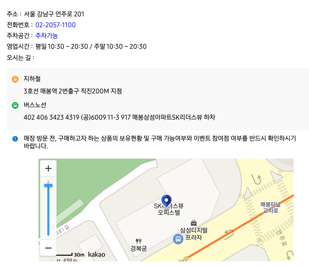 반면 삼성은 잘 정리된 문서처럼 항목에 따라 구분된 정보를 제공하고, 매장 방문 전 주의사항을 명확하게 안내한다.