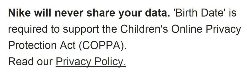 스포츠 의류 브랜드 나이키 브랜드에서는 명확하고 단호한 어투로 사용자의 개인정보가 필요한 이유를 설명해 사용자를 납득시킨다.