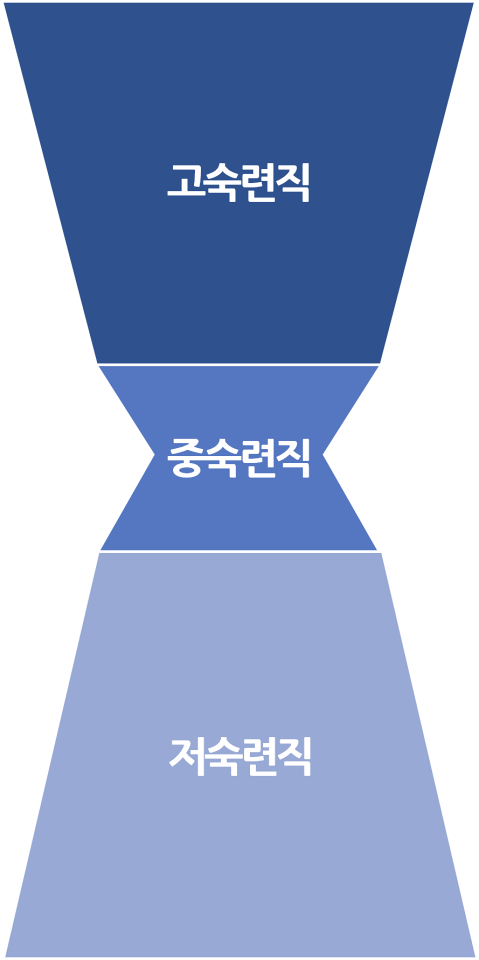 옆에 그림은 기존 현대사회의 직업 종사자수를 저숙련직 부터 중숙련직, 고숙련직까지 수준별로 나타낸 것이다. 그림에서 보다시피 현대사회의 일자리는 피라미드형 모델로 구성되어 있음을 알 수 있다.