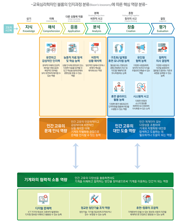 10대 역량을 대표하는 핵심 키워드 3가지를 추출하면 메타인지, 창의성, 공감지능이다. 앞으로 이 역량이 높은 사람들은 디지털 전환기 시대에 각광받는 주요인재가 될 것이다. 아래 그림은 미래창조과학부 미래준비위원회에서 발표한 미래사회 인간에게 필요한 보유역량을 제시한 자료이다. 그림에는 3대 미래역량과 11대 세부역량에 관한 정의가 상세히 기재되어 있다.