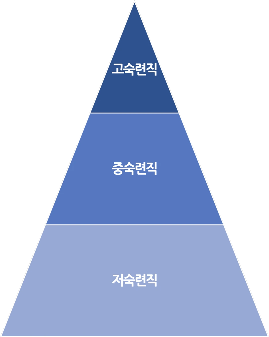 단순노무·서비스직과 같은 저숙련직 종사자수가 가장 많고, 경영사무·교육행정과 같은 중숙련직이 그다음이다. 고소득 사업자와 변호사, 의사, 회계사와 같은 고숙련 전문직의 종사자수는 가장 적은 까닭에 피라미드의 꼭대기에 위치한다.
