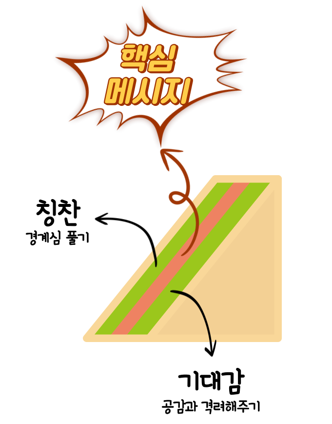 잠시 샌드위치 모양을 떠올려보자. 샌드위치는 ‘빵+내용물+빵’의 3단 구조로 되어 있다. 샌드위치의 핵심은 역시 내용물이다. 샌드위치 피드백은 우리가 전달할 요구사항을 겉으로 드러내지 않고 깔끔하게 포장해서 전달하는 것과 같다. 샌드위치 피드백은 다음과 같이 총 3단계로 이뤄진다.