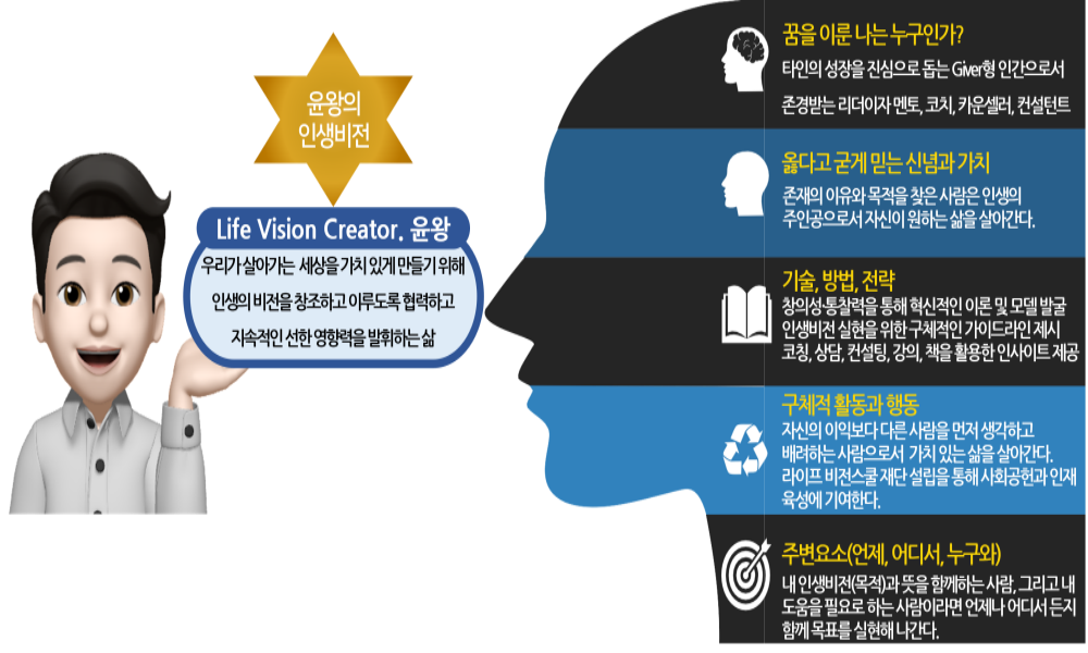 이해를 돕기 위해 인생비전 실현을 위한 NLP의 성공원리를 그림으로 도식화해 보았다. 이 그림은 우리 뇌의 NLP(자기조절 프로그래밍)을 구조화한 것이다. 자기이해가 명확한 사람은 피라미드의 꼭대기부터 차례대로 채워나가면 된다. 만약 작성이 힘들다면 순서와 상관없이 주어진 빈칸을 채워보자. 당신이 이 그림에 제시된 프로세스를 이해하고 실천한다면 자신만의 인생비전을 수립할 수 있을 것이다. 생각보다 작성이 힘들다면, 아래 제시된 윤왕의 NLP 인생비전 수립 샘플 자료를 참고하여 다시 작성해 보자.
