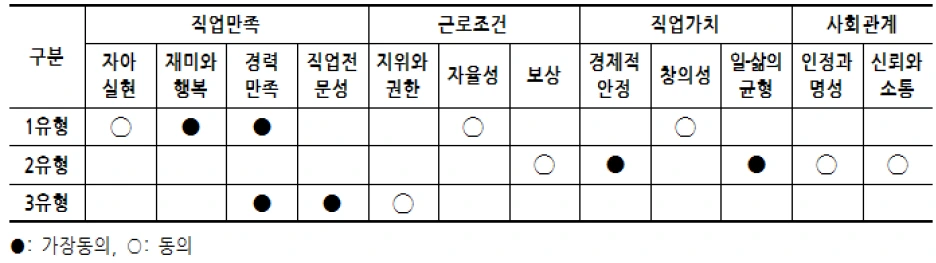 위의 그림에는 유형별 성공의 정의와 특징이 제시되어 있다. 워드 클라우드 분석을 바탕으로 각 유형별 중요하게 생각하는 성공의 키워드를 정리해보았다. 그림을 보면 1유형은 자율성과 직무만족, 2유형은 워라밸과 경제적 자유, 3유형은 전문성과 영향력을 성공의 주요한 키워드로 인식함을 알 수 있다.