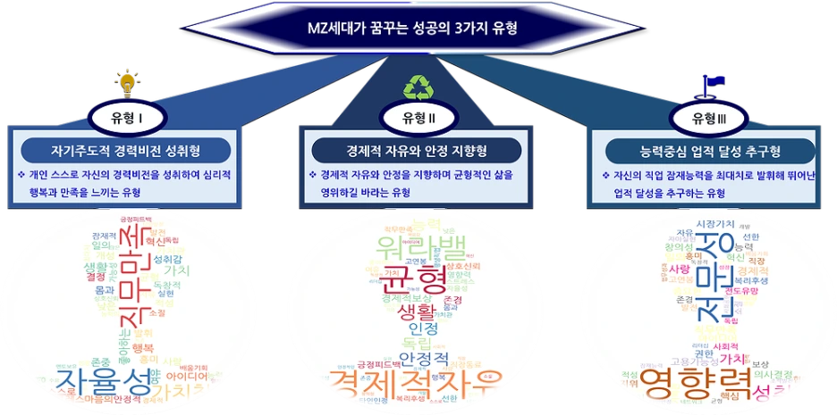 요즘 MZ세대가 바라는 성공은 기성세대가 정의하는 성공과 무엇이 다르고 어떠한 특징이 있을까? 연구결과 밀레니얼 세대가 바라는 성공의 유형은 크게 3가지로 분류되었다. 1유형은 자기주도적 경력비전 성취형, 2유형은 경제적 자유와 안정 지향형, 3유형은 능력중심 업적 달성 추구형이다. 이 3가지 유형은 각각 뚜렷한 차이점과 특성이 존재하였다.