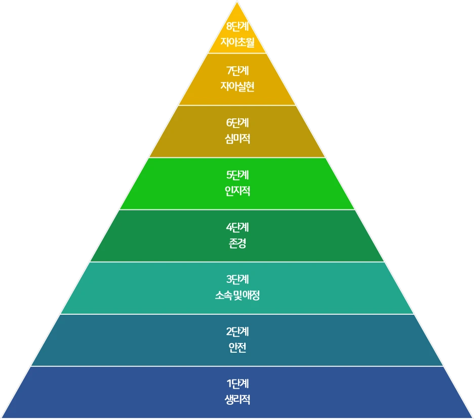 심리학자 '에이브러햄 매슬로우'는 인간의 욕구를 총 8단계로 분류하였다. 매슬로우는 인간의 욕구가 최초 1단계인 생리적 욕구부터 최종 8단계인 자아초월의 욕구까지 순서대로 진행된다고 밝혔다. 즉, 하위단계의 욕구가 충족되어야 비로소 상위단계의 욕구를 충족하고자 하는 마음이 생긴다는 것이다.