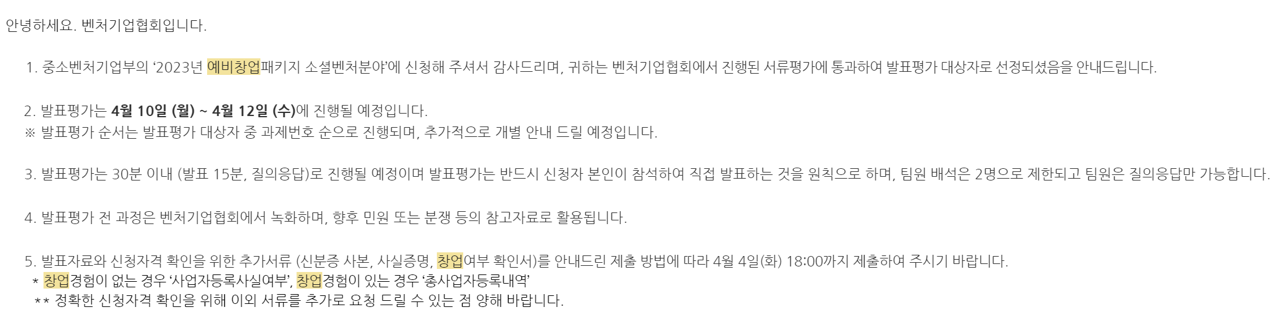 예비창업패키지 서류 합격 후 발표평가 안내 메일 일부 발췌