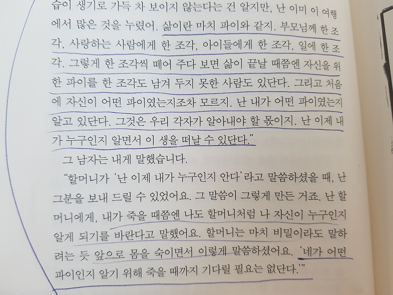 "사실 내 안에는 모든 나이가 다 있네. 난 세 살이기도 하고 다섯 살이기도 하고, 서른일곱 살이기도 하고, 쉰 살이기도 해. 그 세월들을 다 거쳐 왔으니까 말이야. 나는 그때가 어떤지를 알지. 어린애가 되는 것이 적절할 때는 어린애인 게 즐거워. 또 현명한 노인이 되는 것이 적절할 때는 현명한 어른인 게 기쁘네. 어떤 나이 든 될 수 있다는 걸 생각해 보게. 지금 이 나이에 이르기까지."