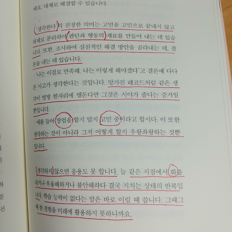 하지만 생각만으로 그치고 고민이 고민으로만 그치며 결과를 도출해내는 경우가 흔치 않아 같은 상황과 비슷한 상황 속에서 매번 제자리걸음을 하게 되죠. 이 책에서는 고민과 생각에 대한 내용으로 기록되어 있습니다. 즉, 고민이 생겼을 때 고민으로만 끝내지 말고, 판단과 행동으로 만들어내라 라는 거죠