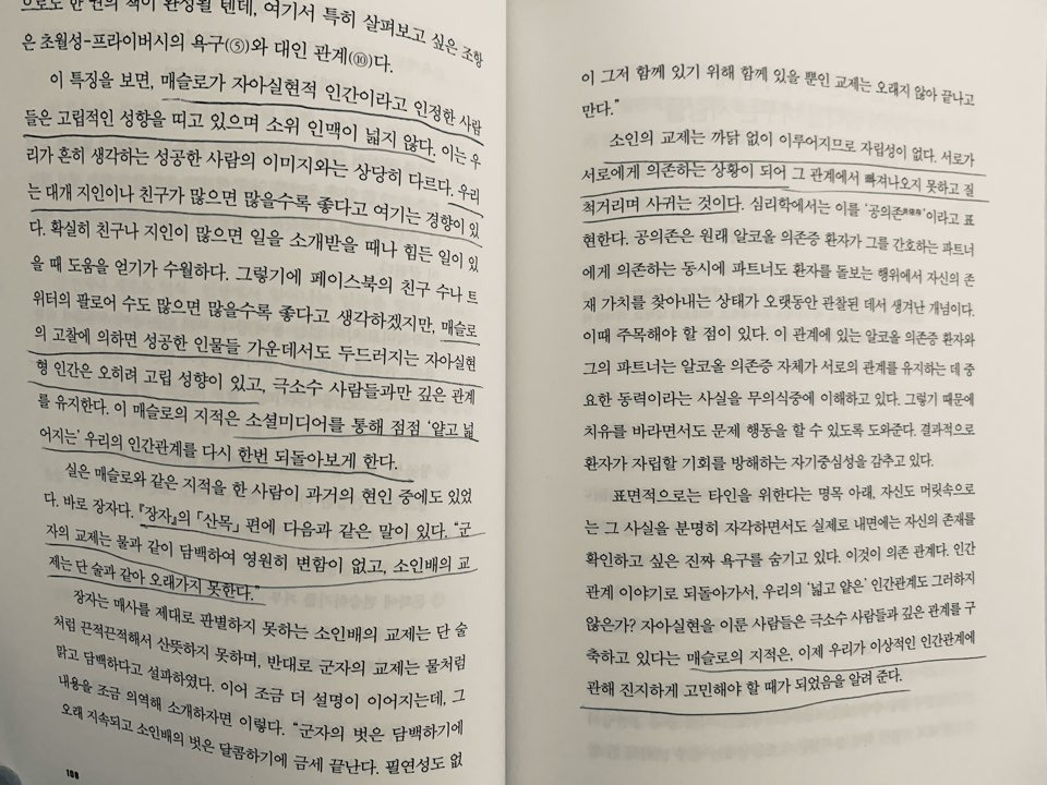 매슬로가 말한 자아실현적 인간은 사실 인맥이 넓지 않다. 그들은 마음이 넓고 깊은 대인관계를 유지하며 소수의 사람들과 특별히 깊은 유대 관계를 맺고 있다고 한다. 특히 소설미디어를 통해 얕고 넓은 인맥관계에 대해 되돌아보라고 한다. [장자]의 [산목] 편에 다음과 같은 말이 나온다. “군자의 교제는 물과 같이 담백하여 영원이 변함이 없고, 소인배의 교제는 단 술과 같아 오래가지 못한다.” 새로운 곳에 정착하면서 새로운 사람들과 교류를 하게 되었다. 모르는 사람들에게 수십 번 같은 인사말과 통성명, 나이 등을 소개하고 나니 회의감이 느껴졌다. 내가 왜 교류를 하려고 하는가.