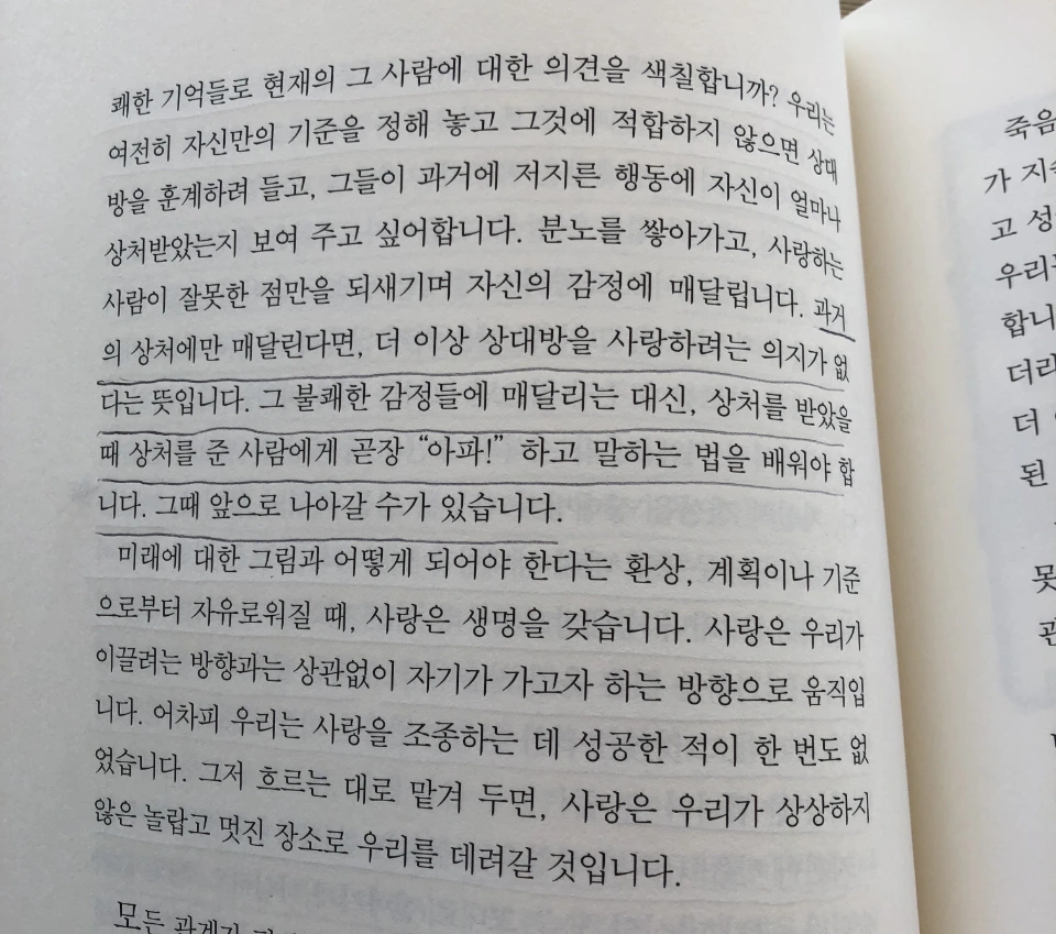 <인생수업> 책에 있는 많고 많은 밑줄 중에 오늘은 이걸로 택했습니다. 저는 사실 곧장 아프다고 말하기보다는 감정이 좀 사그라들고 나서 기회를 봐서 얘기하는 편인데 그러다 보니 시간이 좀 지나면 기회가 오히려 찾기 어려워지거나 나도 잊어버리거나 해서 그냥 지나가 버리는 경우가 많았어요. (특히 일상을 함께 하는 남편과 요) 그런데 그러다 보니 제 안에 불쾌한 감정들이 쌓이고 쌓여서 나중엔 그 사람에 대해 포기하게 되더라고요. 앞으로는 곧장 아프다고 말해봐야겠습니다!