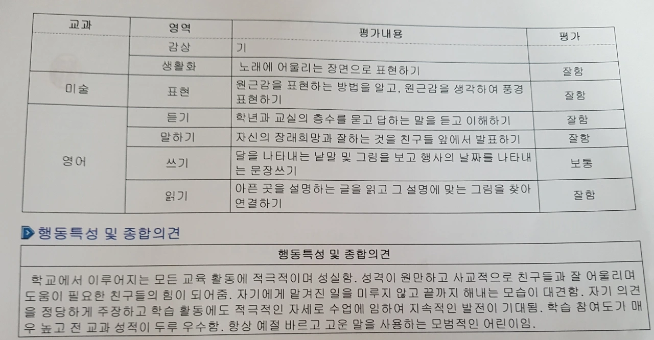 초등학교 1학년 때 아이가 학교에서 기록해온 인쇄물에는 이런 내용이 담겨있었다.