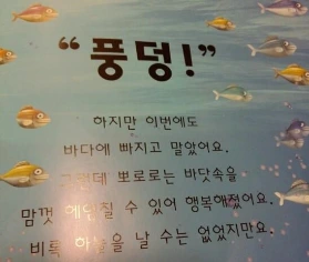 "풍덩! 하지만 이번에도 바다에 빠지고 말았어요. 그런데 뽀로로는 바닷속을 맘껏 헤엄칠 수 있어 행복해졌어요. 비록 하늘을 날 수는 없었지만요."