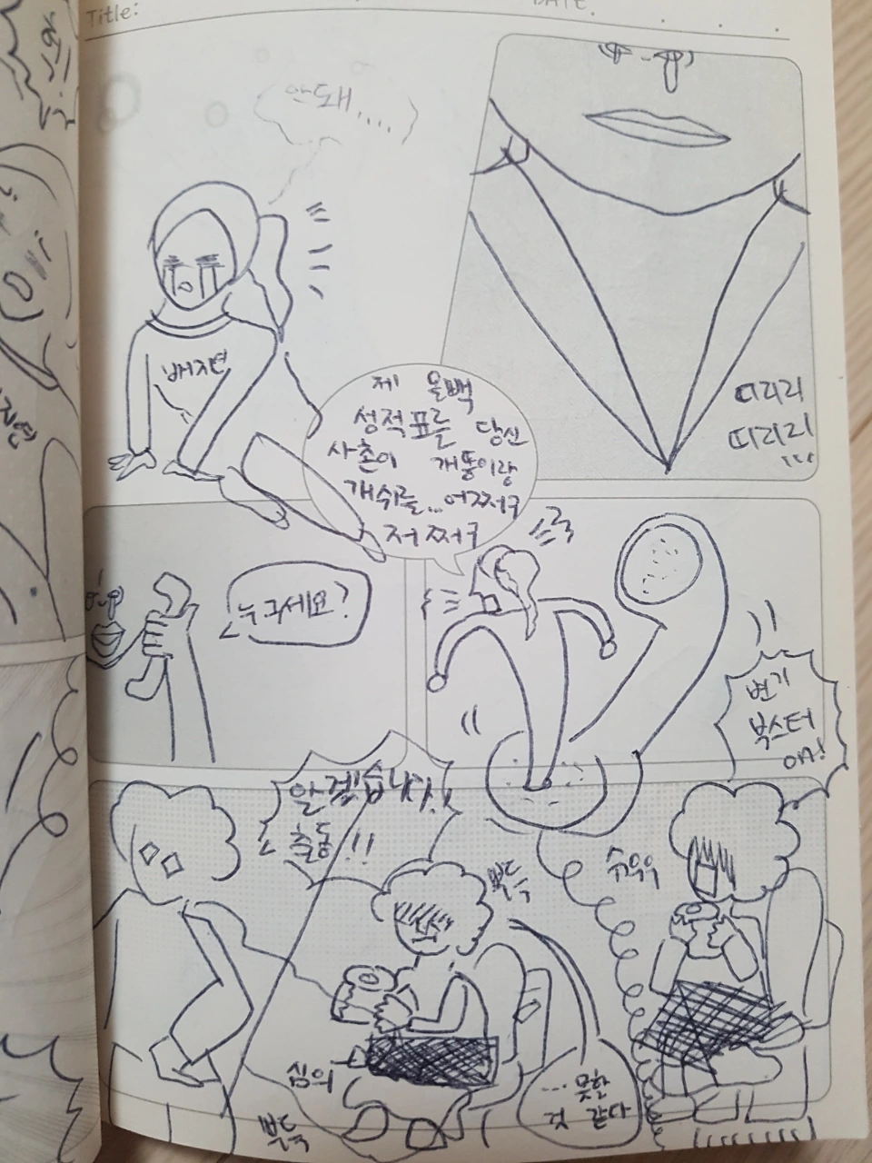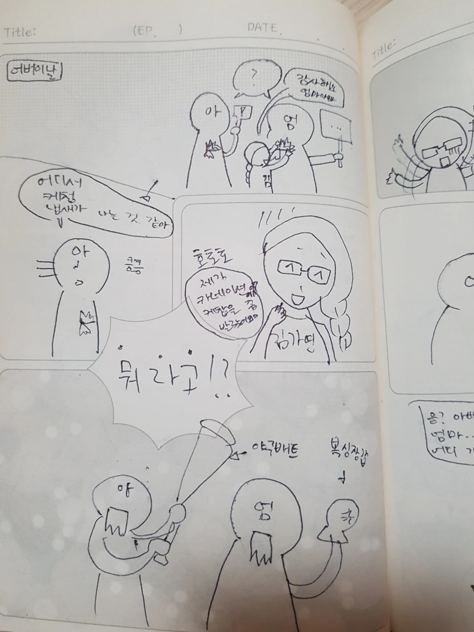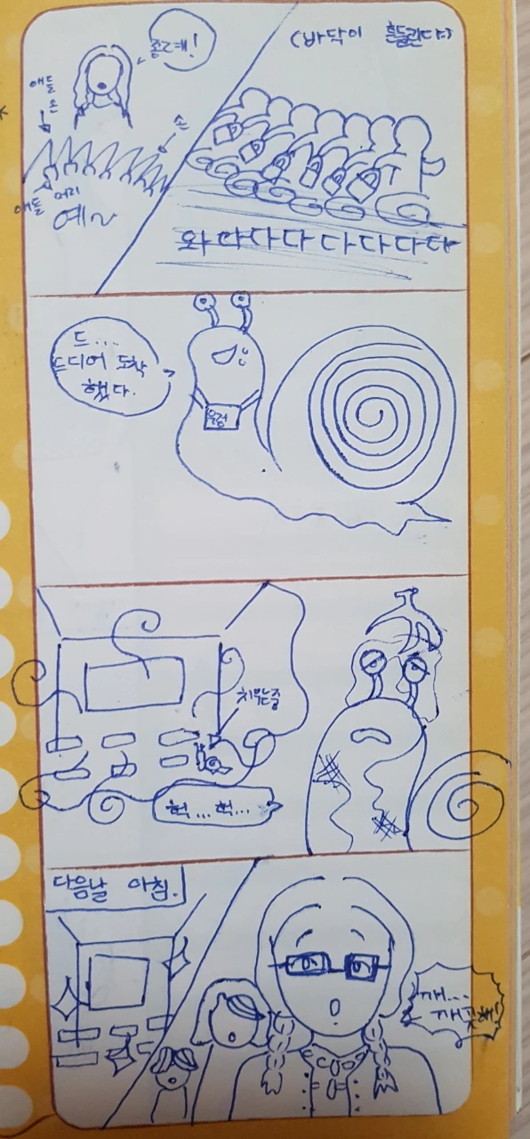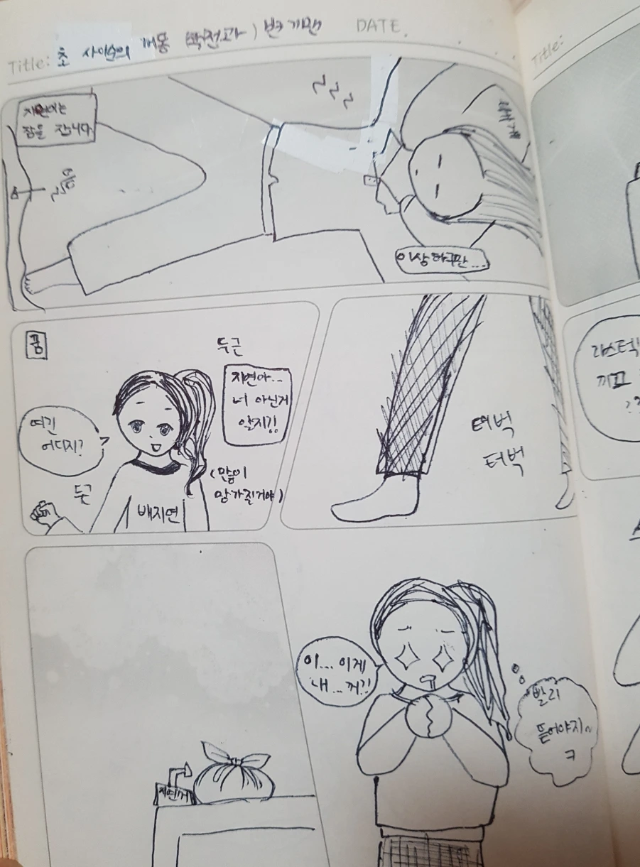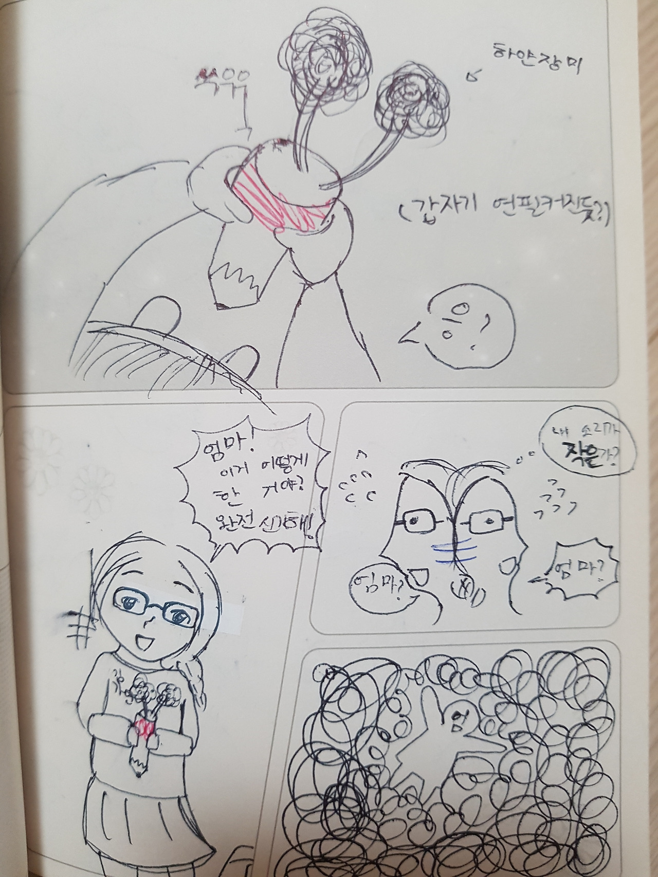 큰아이 방을 한 번씩 정리할 때는 책상 위에 있는 종이쪽지들을 마구 쓸어버리면 안 된다. 애써 그려놓은 그림들, 반짝 생각나는 이미지들을 그 자리에서 척척 그려놓기 때문에, 혹여나 내 실수로 버려지는 작품들이 있으면 난감하고 미안한 상황이 더러 생기기 때문이다.