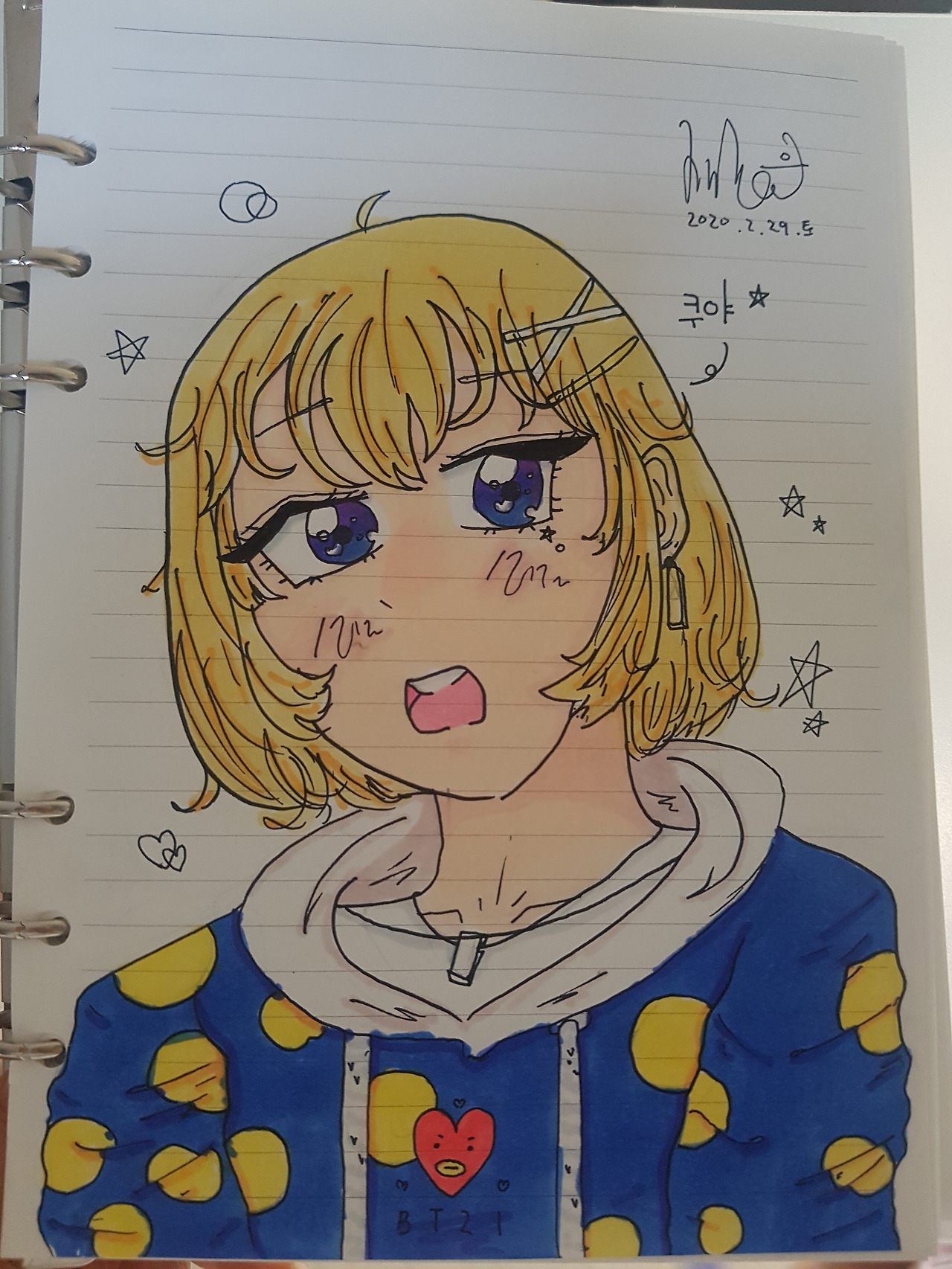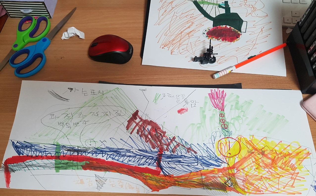 어릴 때부터 다 함께 모여서 그림을 그리며 이야기하다 보니, 둘째도 표현하고자 하는 것이 있으면 자기 나름의 스타일대로 특징을 살려서 곧잘 그려낸다. 어릴 때부터 유치원 선생님이 둘째는 표현하고자 하는 핵심을 부각해서 잘 그린다고 하셨다.
