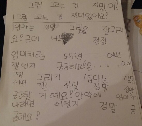 첫째는 어릴 때부터 그림을 그리던 만들던 붙이던 표현하는 것을 좋아했다. 첫째를 보면, 즐기는 것이 잘하게 되는 지름길이라는 의미가 머릿속에 떠오른다.