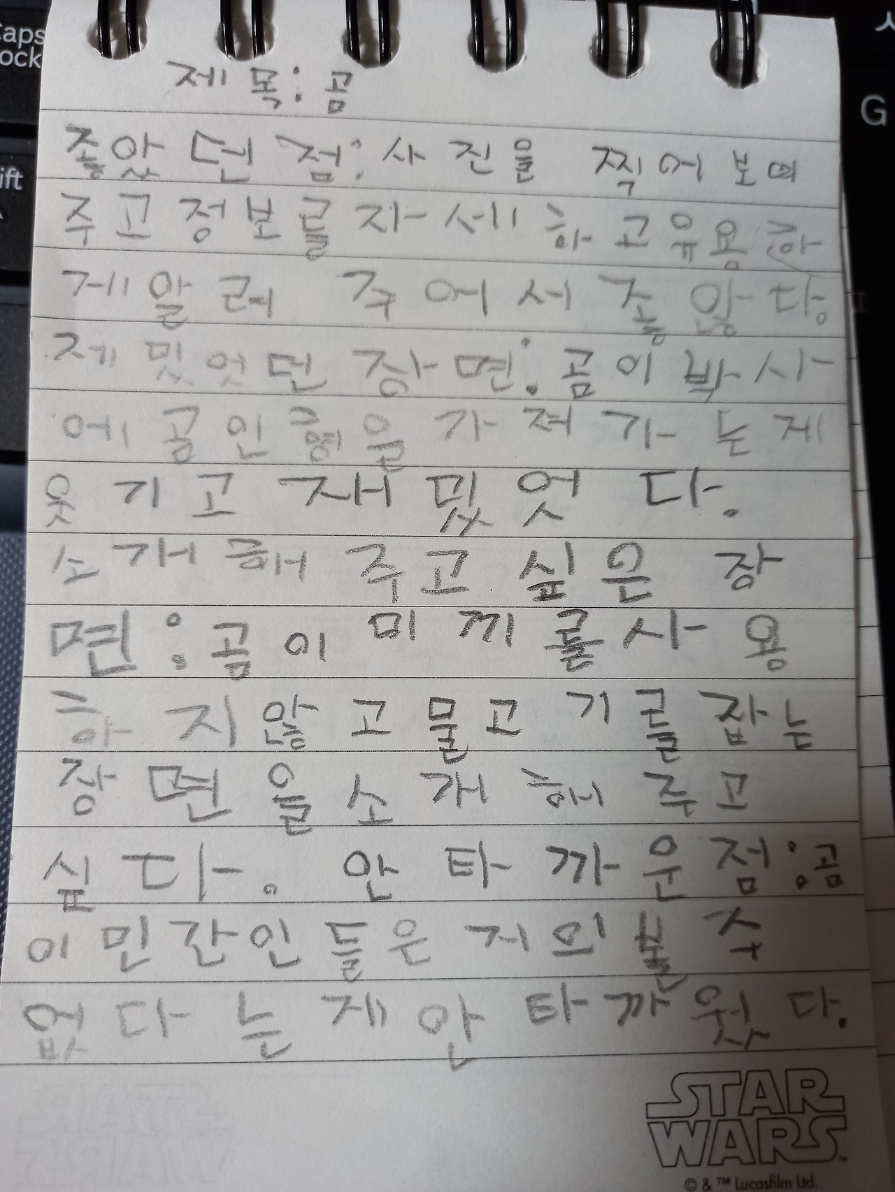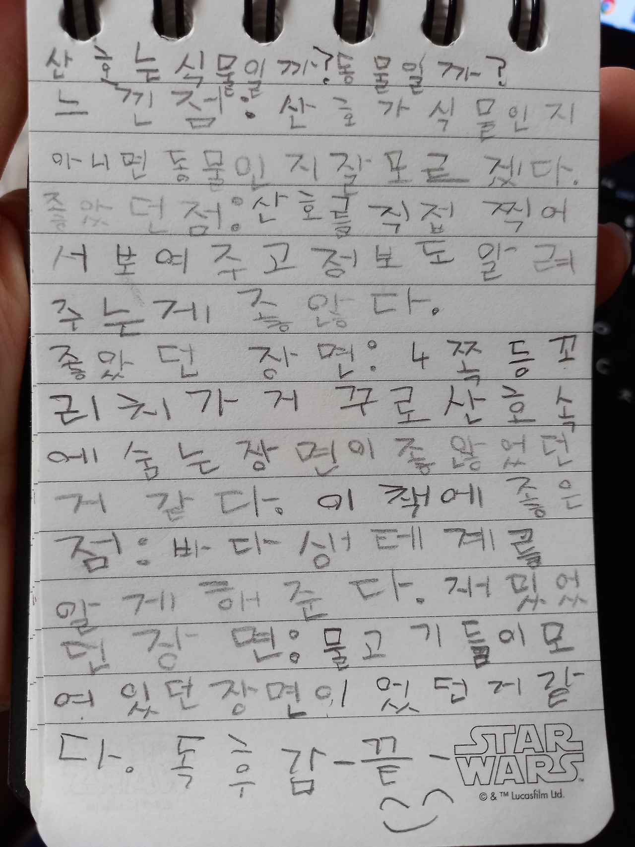 책 읽고 이야기하고 놀았는데 놀다 놀다 요즘 너무 노니까 뭐라도 같이 하면 좋을 거 같아서 수업 모드로 바꿨다. 뭔가를 가르친다기보다, 그저 글을 쓸 수 있는 기회를 주고 싶었다.
