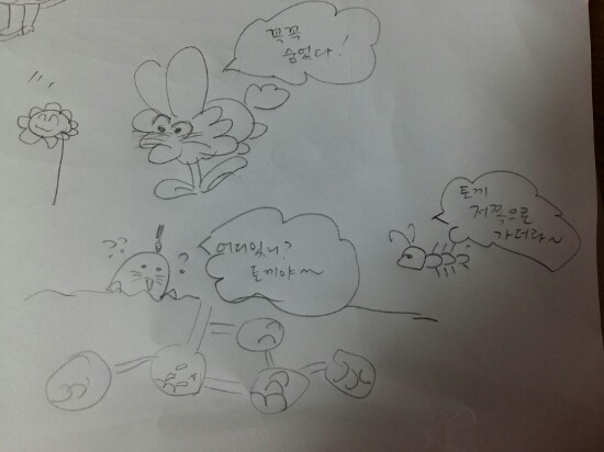 그렇게 시작을 해보려다가 '맘에 안 든다는 이유'로 그만두려고 할 때는 종이를 가져와서 나머지 부분을 내가 채웠다. 그렇게 이야기를 하다 보면 아이가 밝게 웃고, 다시 그림을 그리기 시작하고, 많은 이야기를 이어갈 수 있는 것이 나는 즐거웠다.